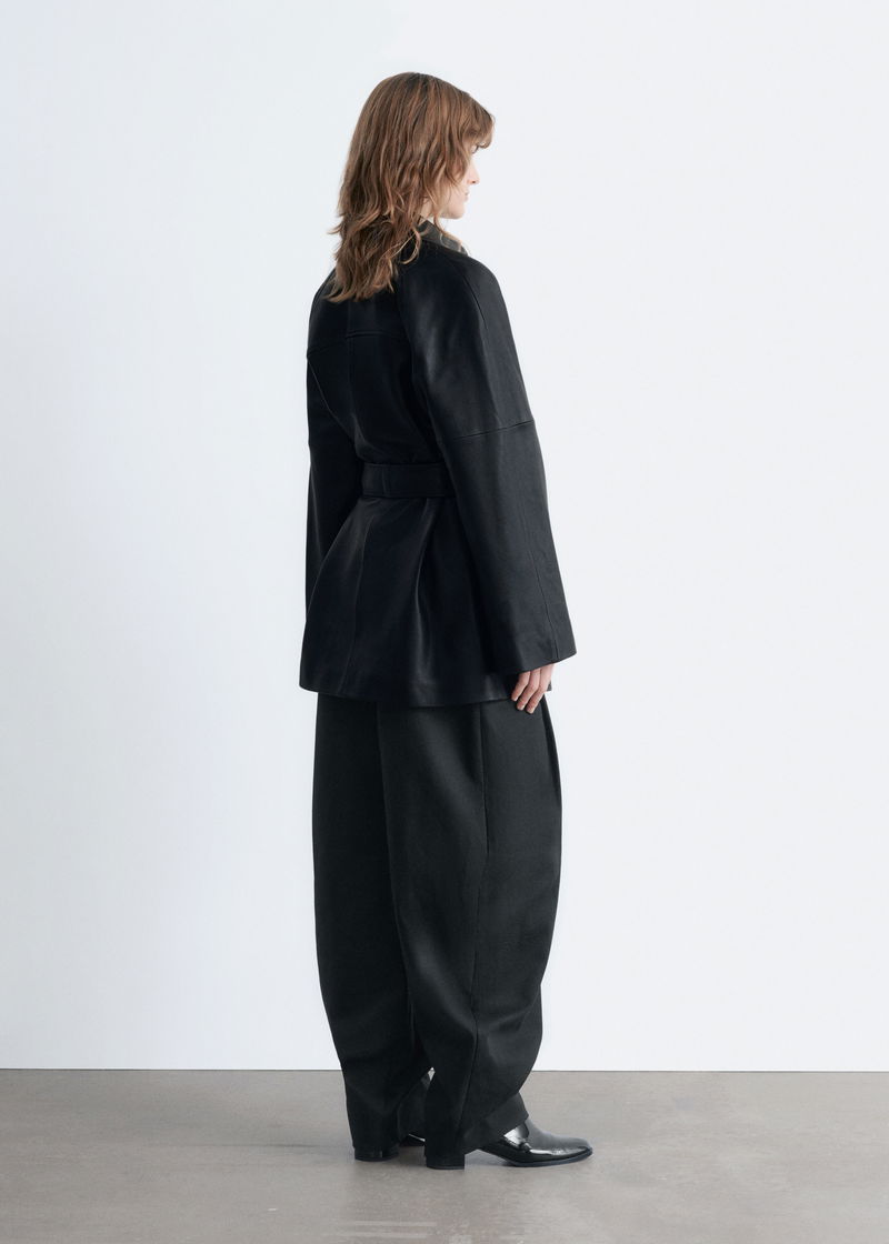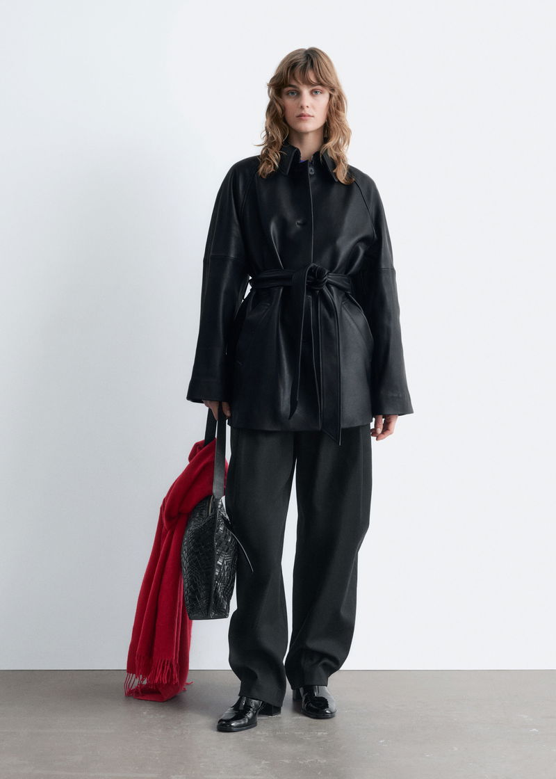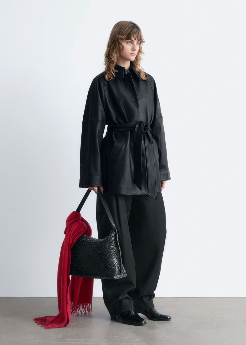 Crafted from supple leather, this coat features a tie belt to create a nipped-in silhouette. Designed with a large collar and hook-and-bar fastening, tone-on-tone button closures, and wide raglan sleeves detailed with cutline seams. Finished with welt front pockets and an inner pocket.