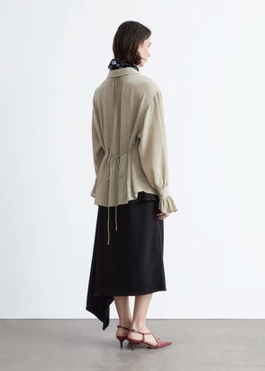Long sleeve blouse with a defined waist, tie up detail and gathered balloon sleeves.
