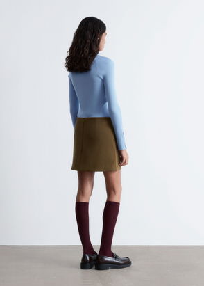 Denim mini skirt detailed duo welt pockets at the front, belt loops and topstitched detailing. Fastened with a zipper at the back.