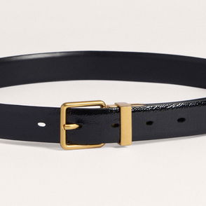 Grained leather belt with a tortoise circle buckle, gold-toned hardware and a wide band.