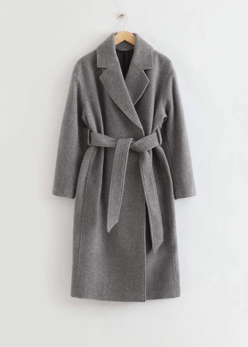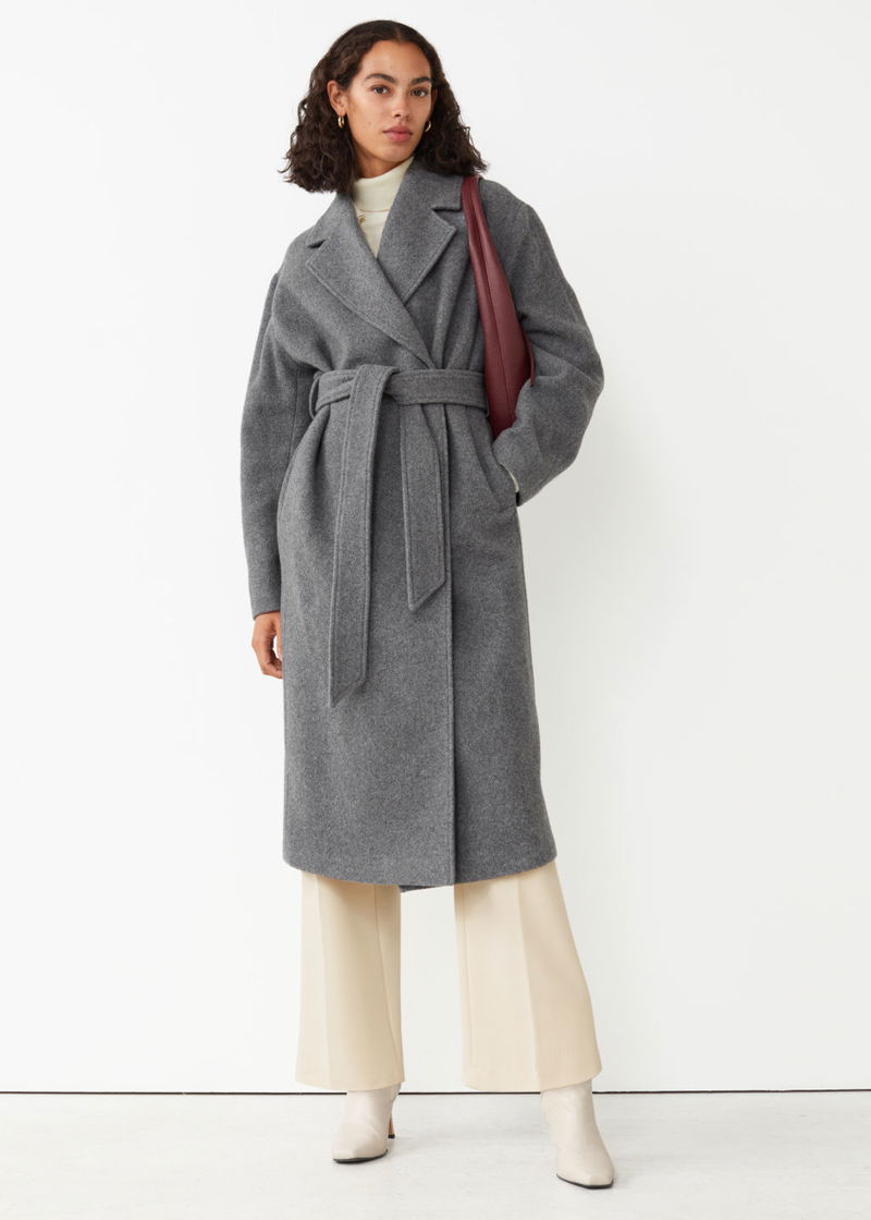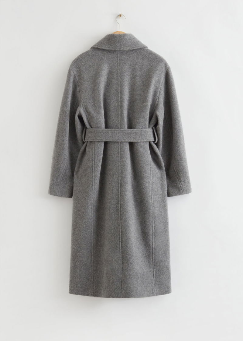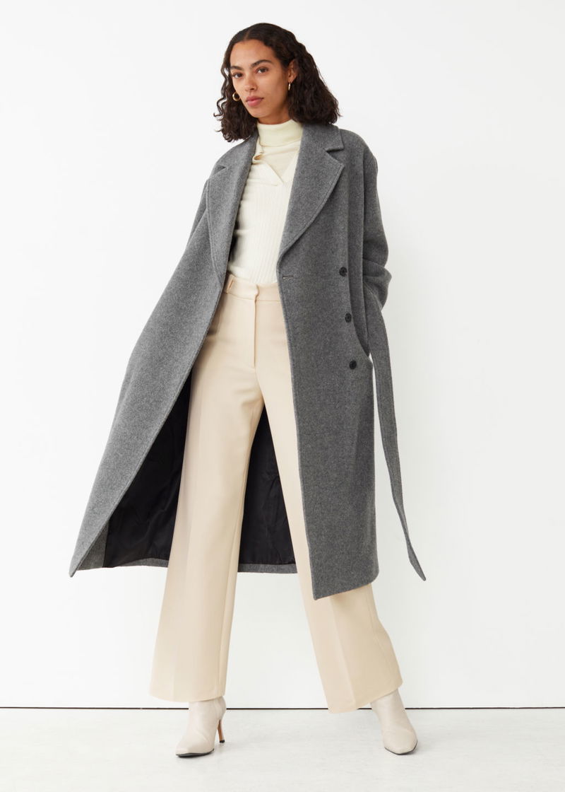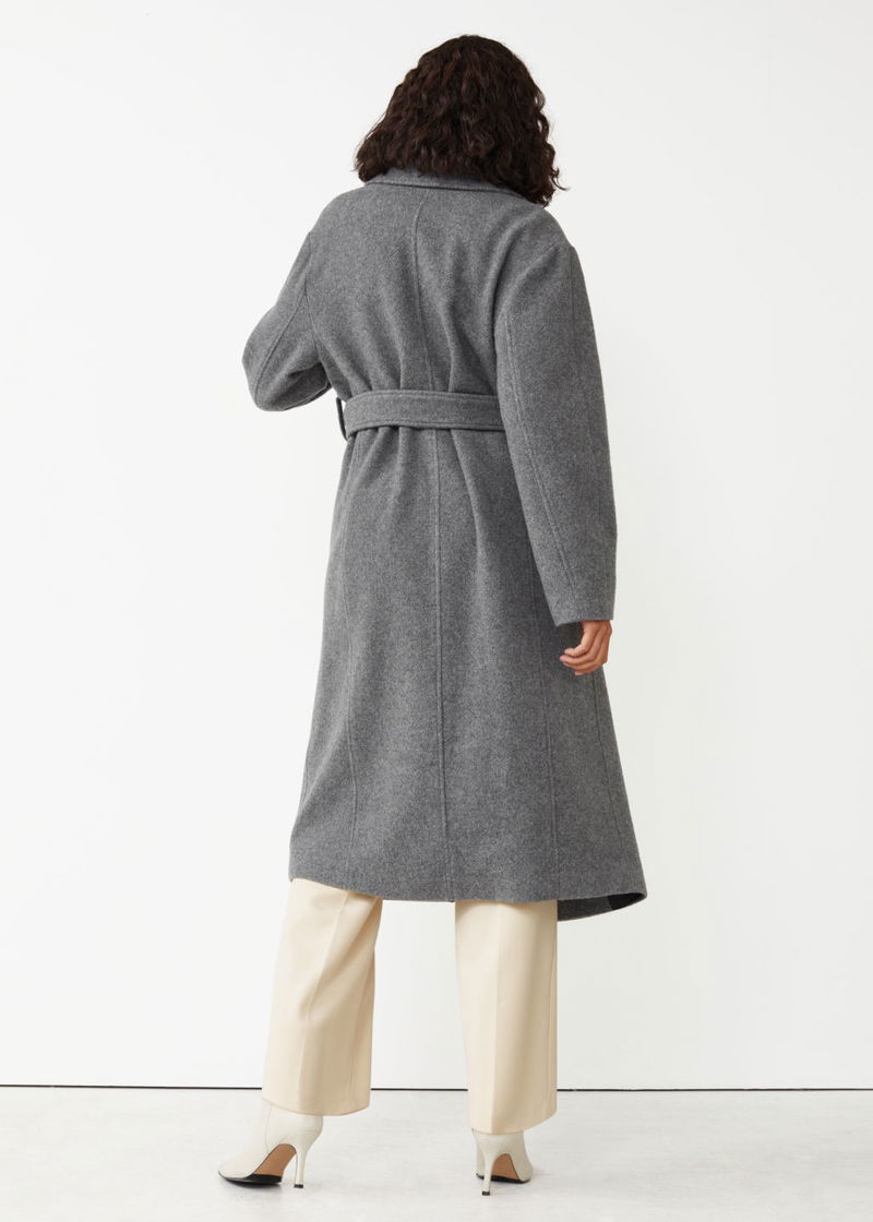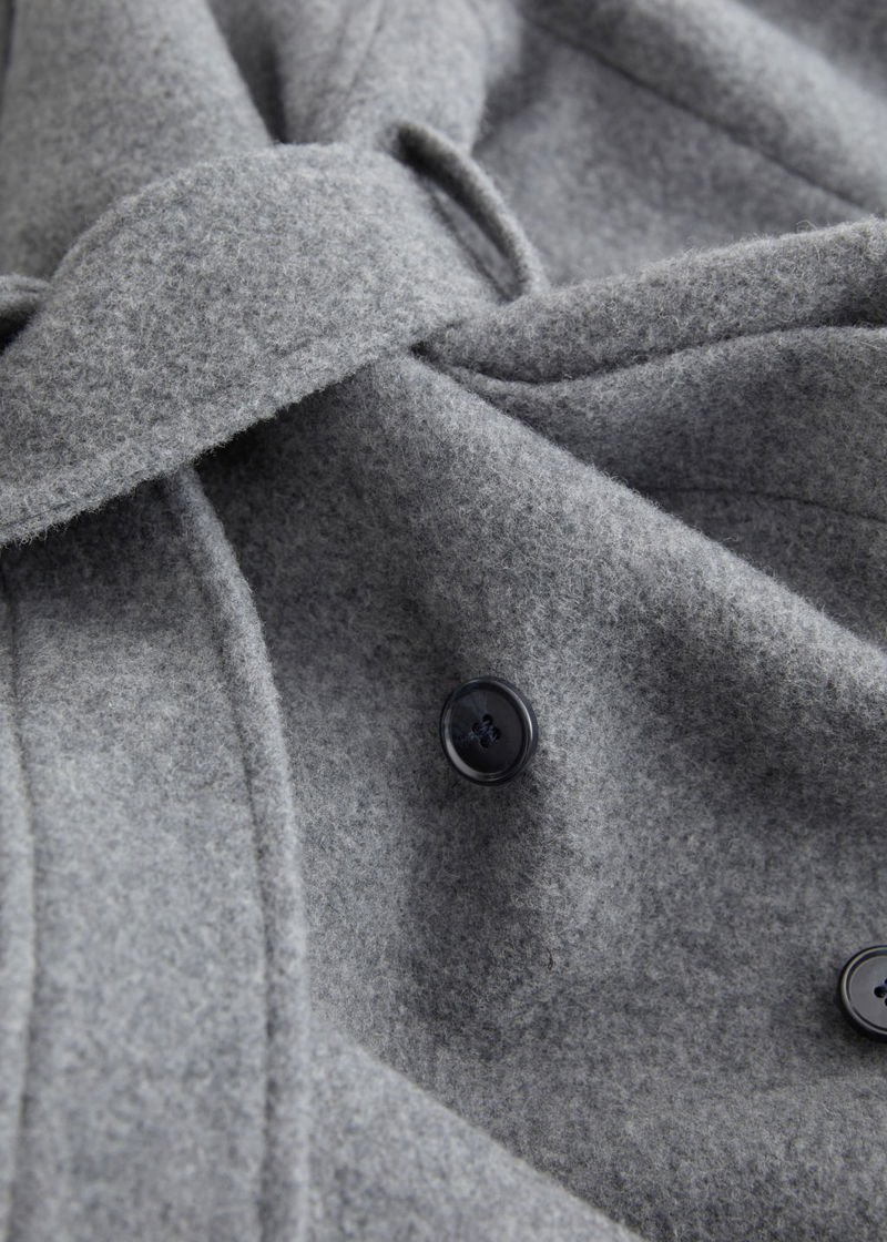 Voluminous double breasted wool coat finished with a tonal self-tie belt. Duo pockets. Three concealed button closures.