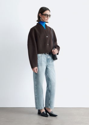 Voluminous long-sleeved wool jacket traced with decorative buttons and two large patch pockets in a loose fitting silhouette.