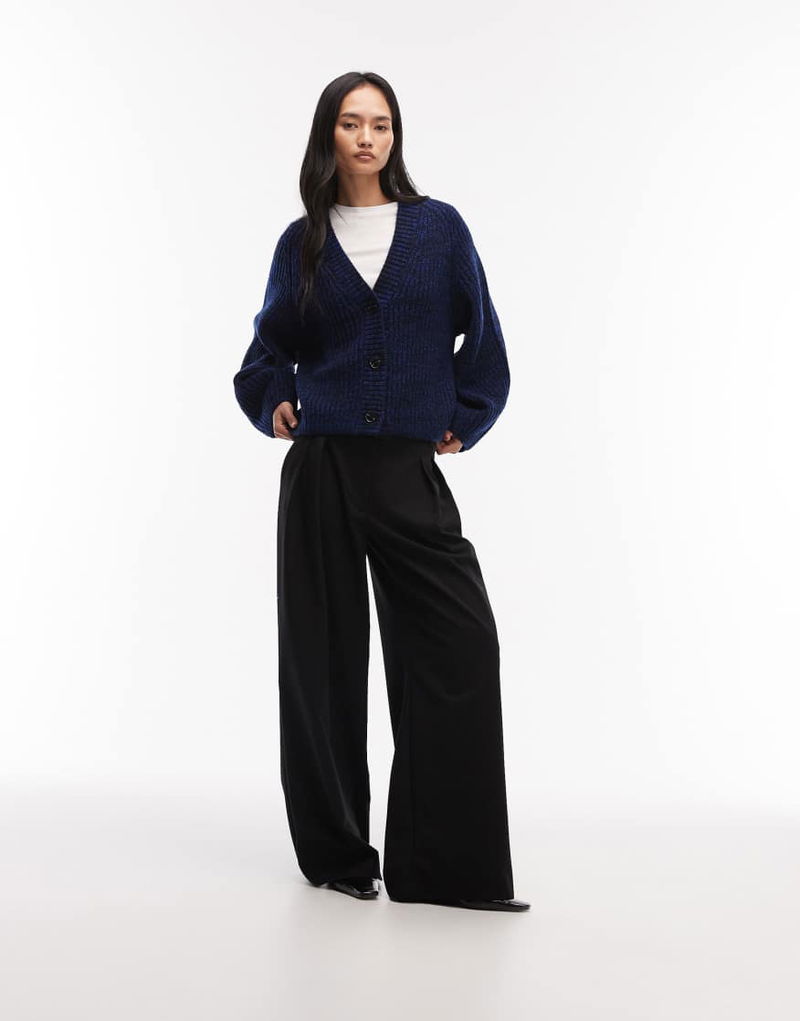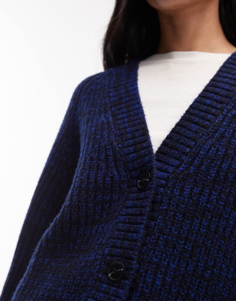 Wool And Cotton Blend V Neck Cable Cardigan In Blue And Black Twist