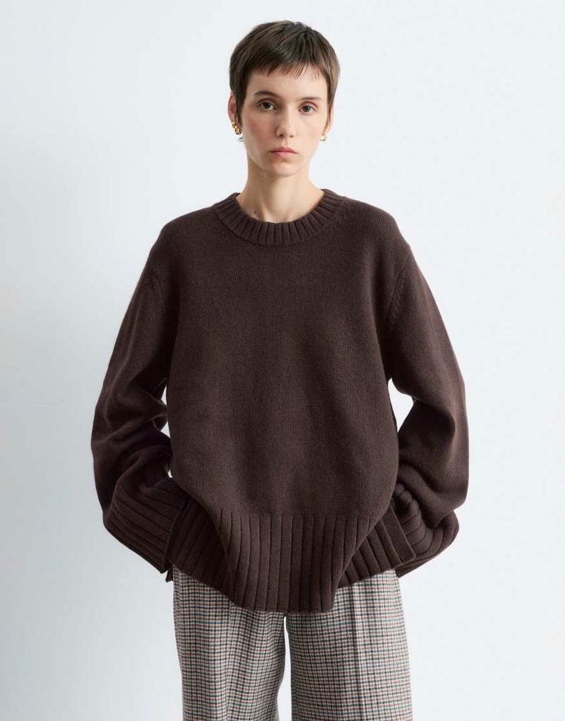 Wool Knitted Oversized Sweater With Deep Rib Hem In Brown