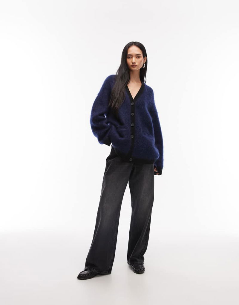 Wool Mohair Mix Oversized Cardigan With Contrast Pockets In Navy