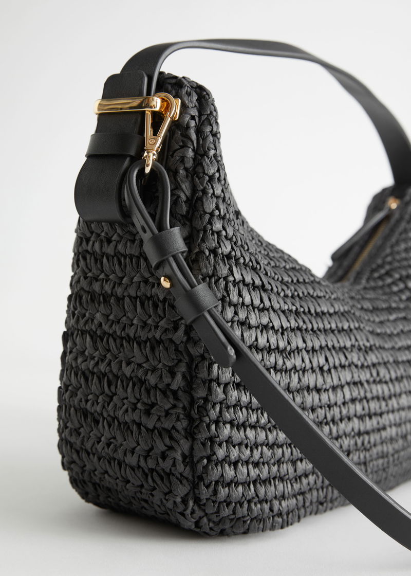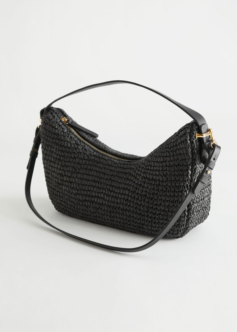Woven straw shoulder bag with a curved silhouette, gold-toned hardware and two leather straps.