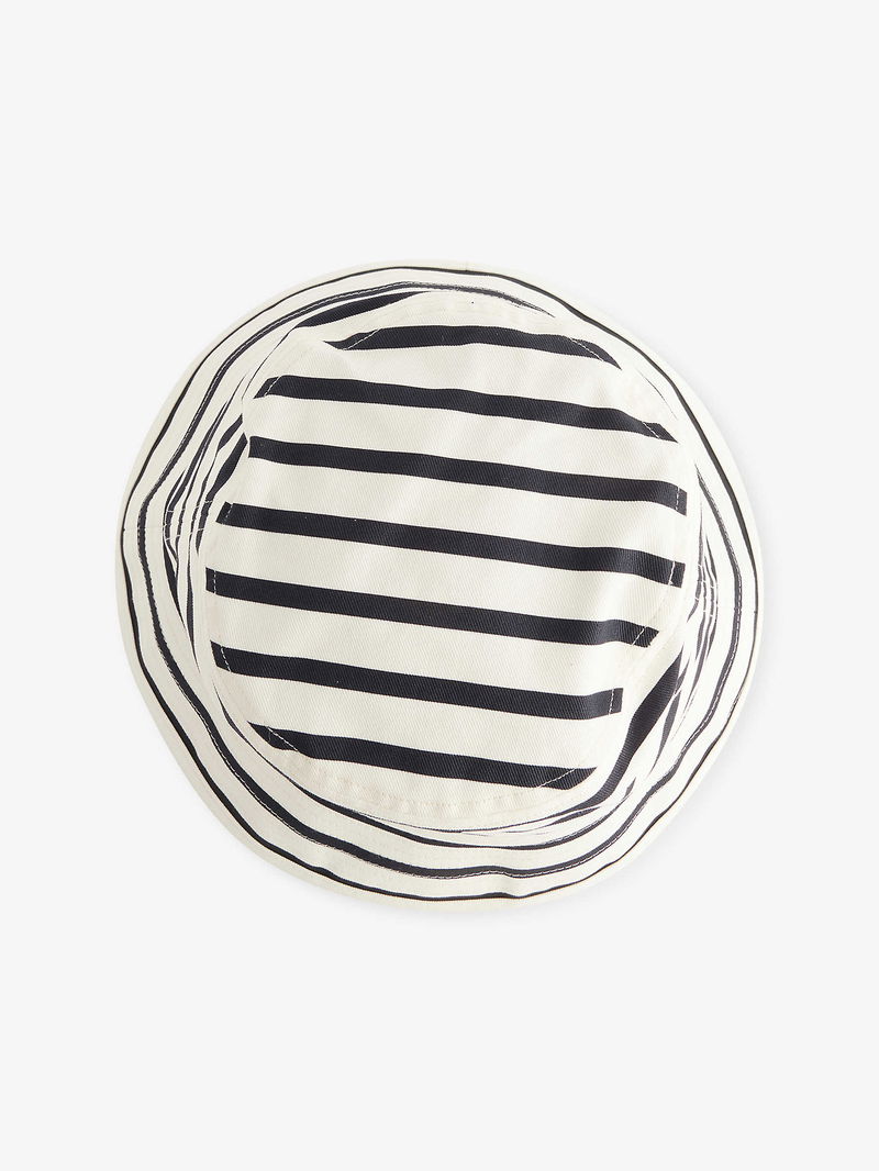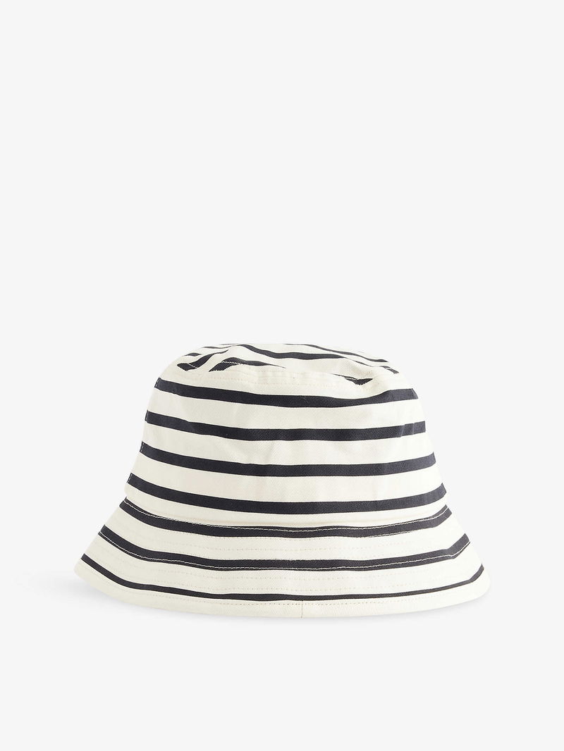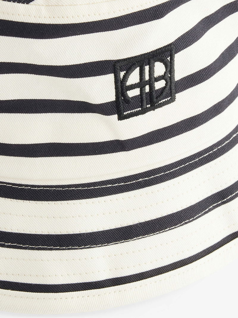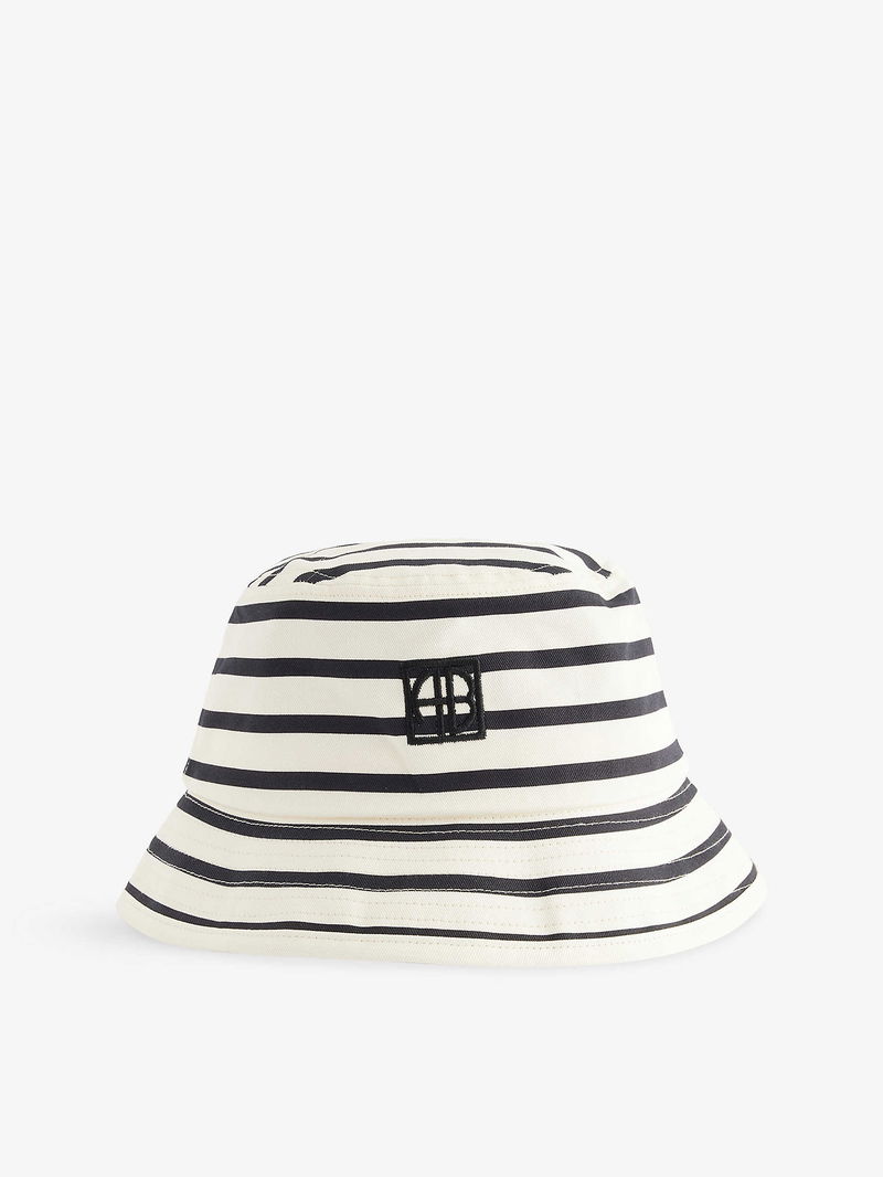 ANINE BING cotton bucket hat. Wide brim, monogram embroidery at front, all-over striped print, internal sweatband.