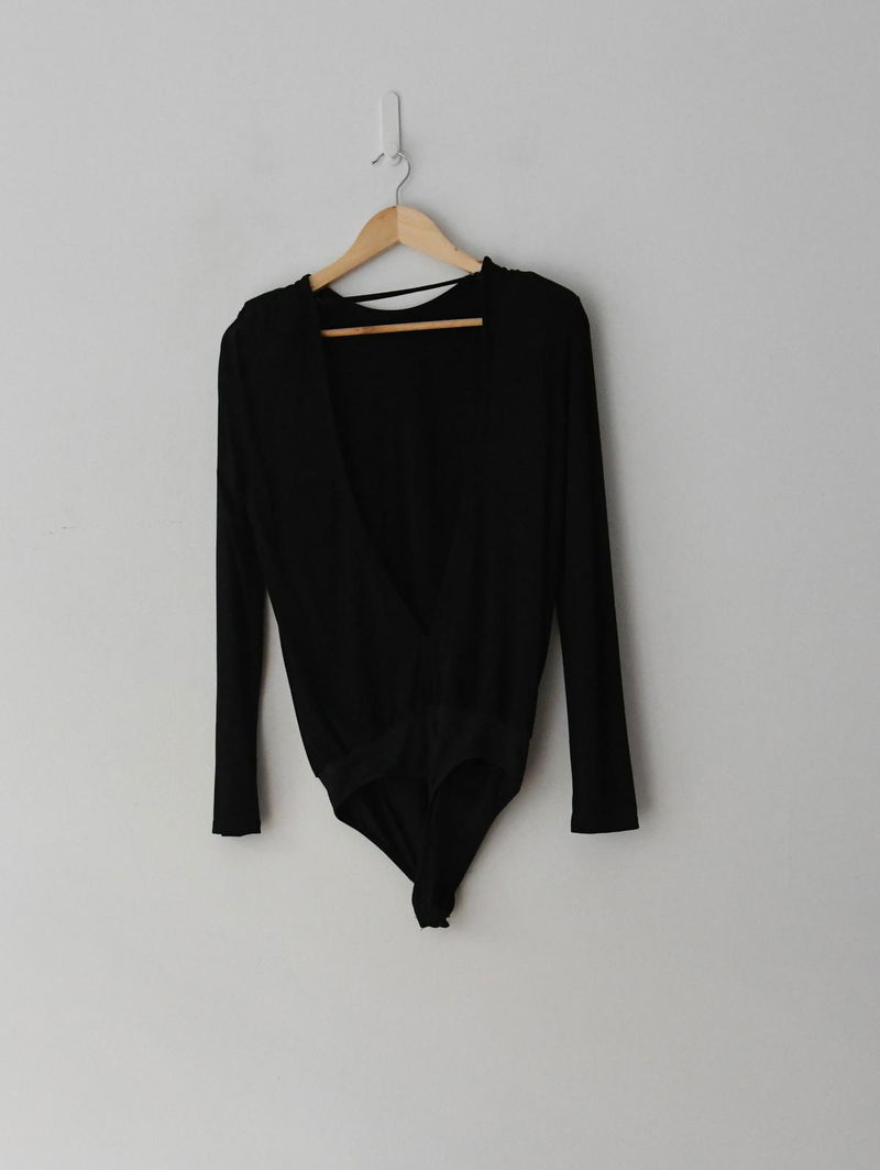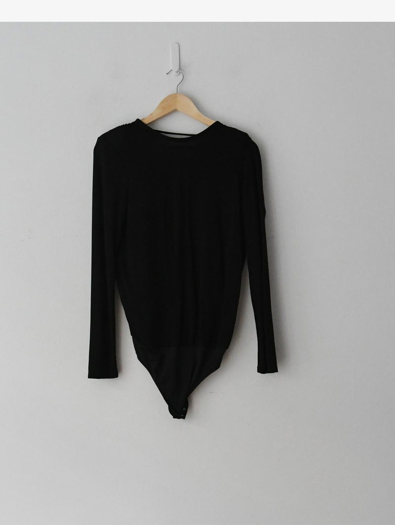 Snap button closure with thong back. Open back with strap detail with loop button closure. Padded shoulders with shirred detail.