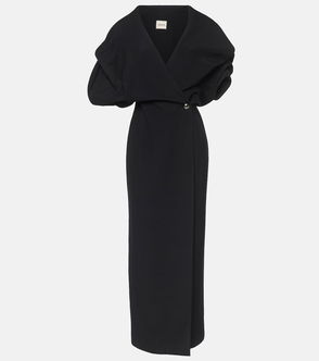 The Victoria maxi dress is a tux-inspired design which wraps around the body, securing at the waist for a double-breasted appearance. Padded shoulders enhance the shape.