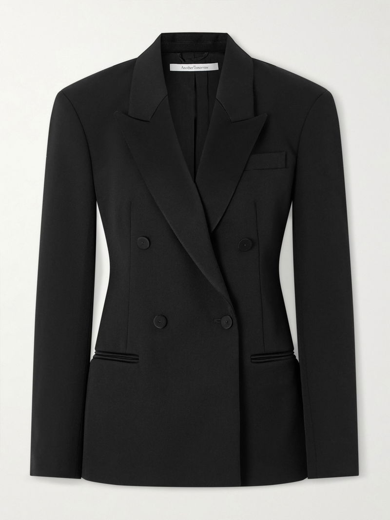 Another Tomorrow's double-breasted tuxedo jacket is elegance defined. It has been tailored in Italy from wool-blend twill and has lustrous satin peak lapels. Wear it for evening with a dress or cigarette pants.