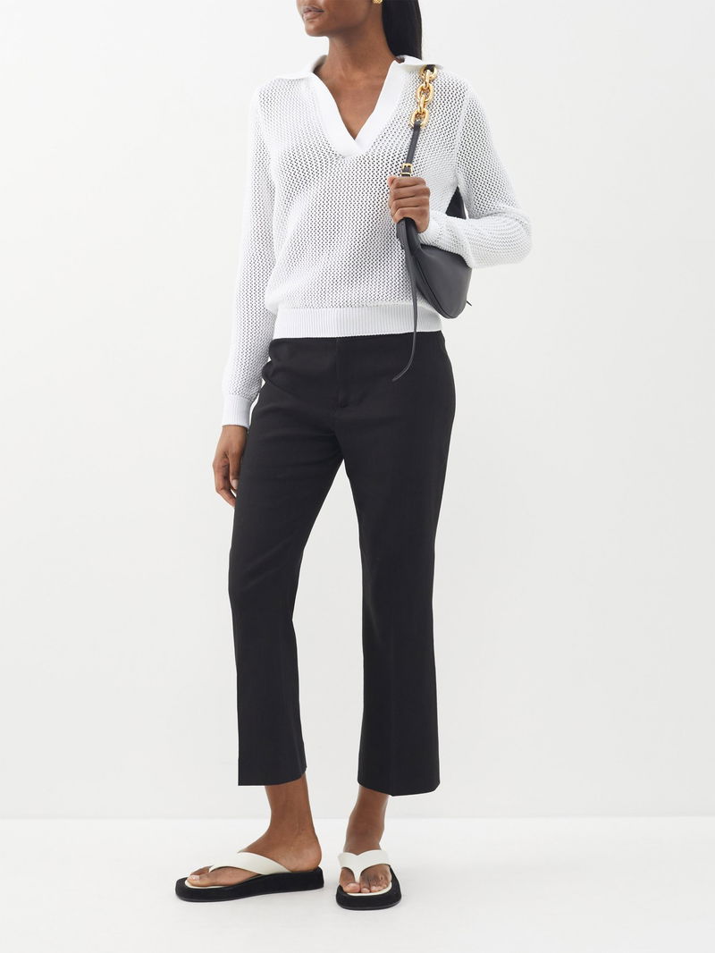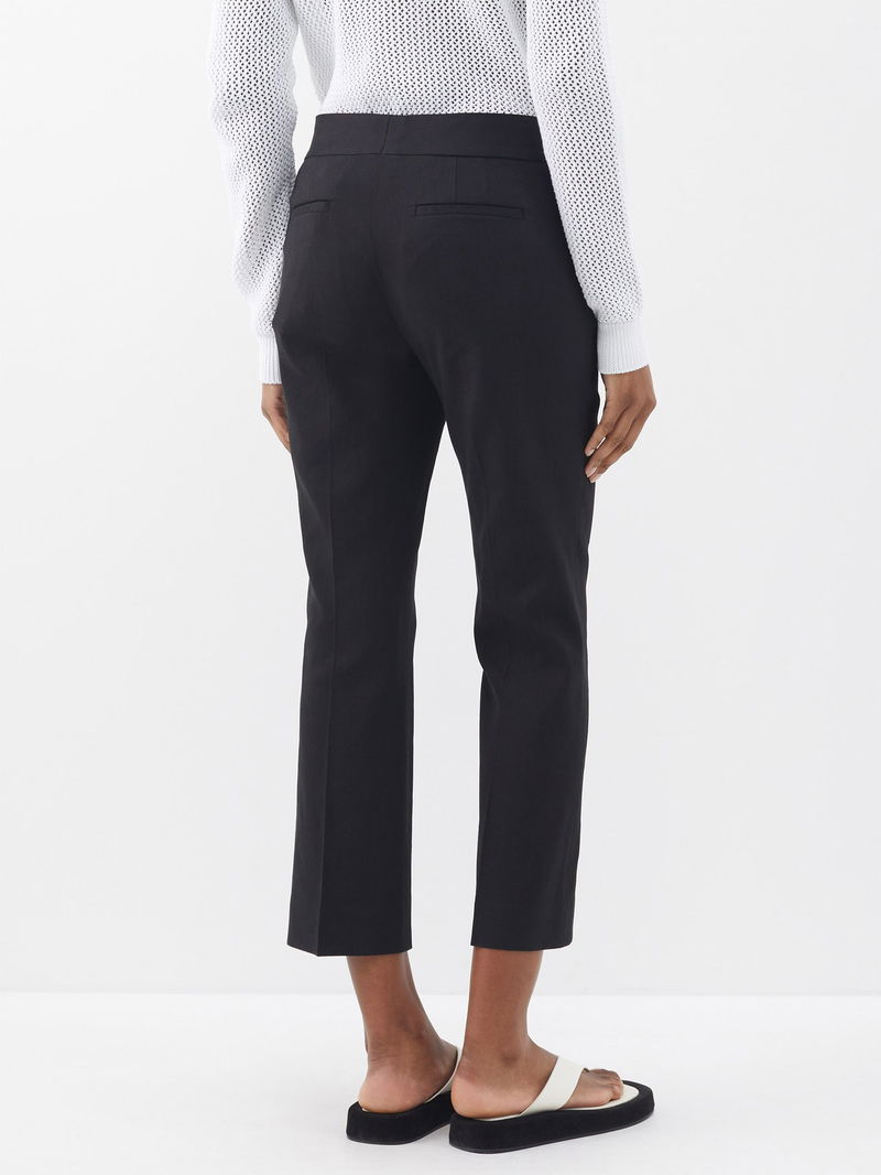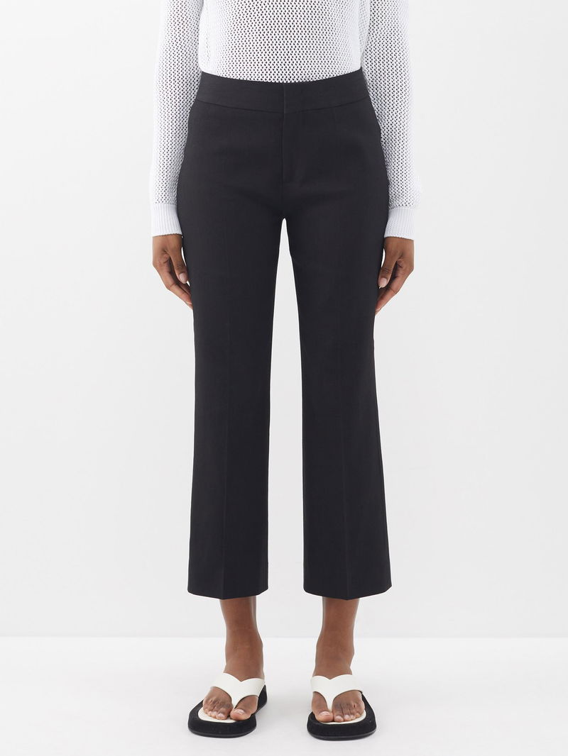 A kick flare and cropped cuff adds a contemporary nuance to Another Tomorrow's black trousers, made from a sustainable hemp and FSC-certified viscose blend.