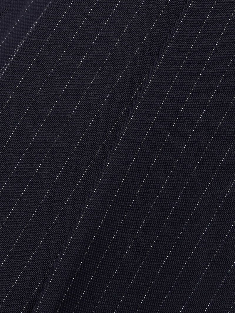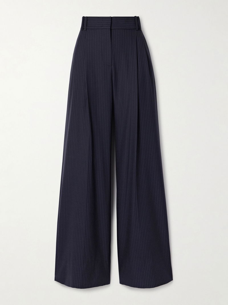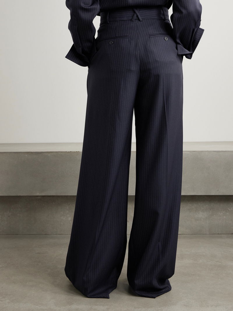 Another Tomorrow's pants are designed with wide legs enhanced by sharp pleats and particularly long, floor-pooling hems. Tailored from a pinstriped wool-blend, they have a high waist complete with belt loops. Wear them with a fitted tank or coordinating shirt.