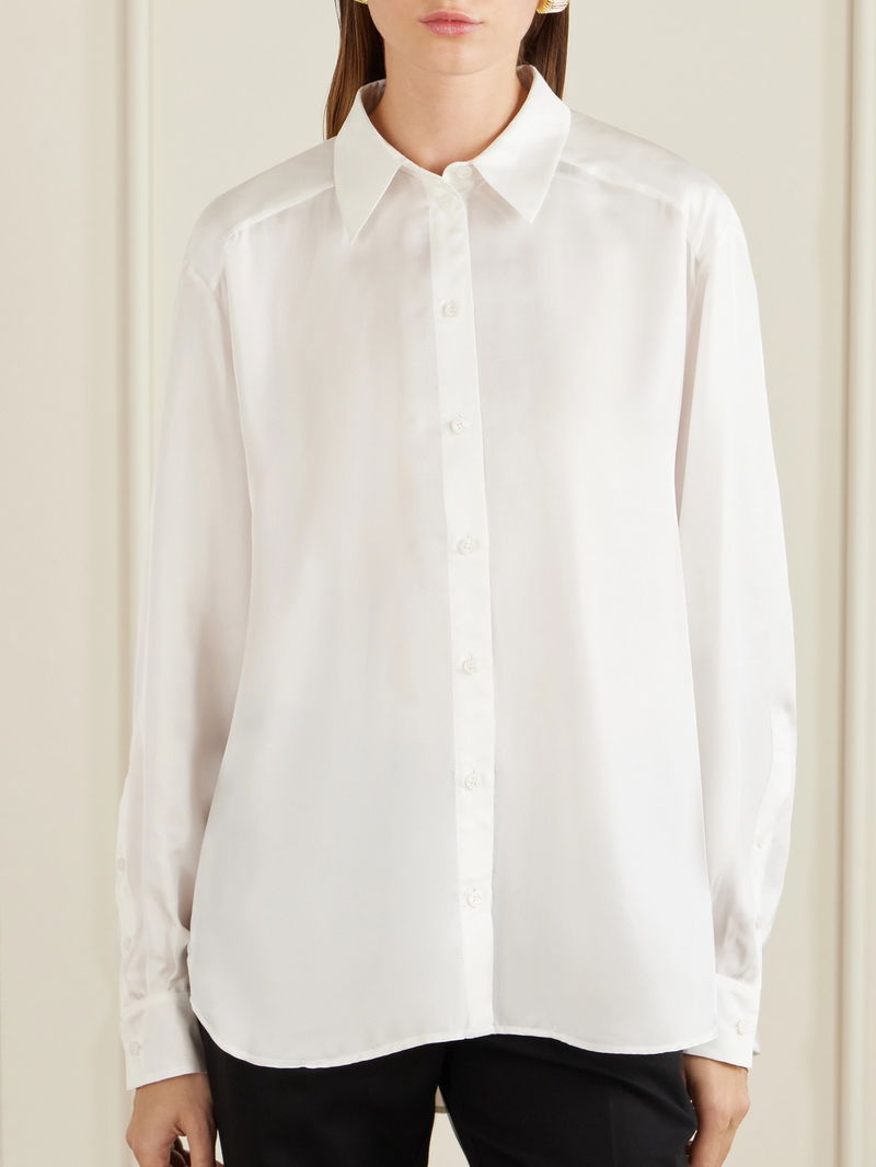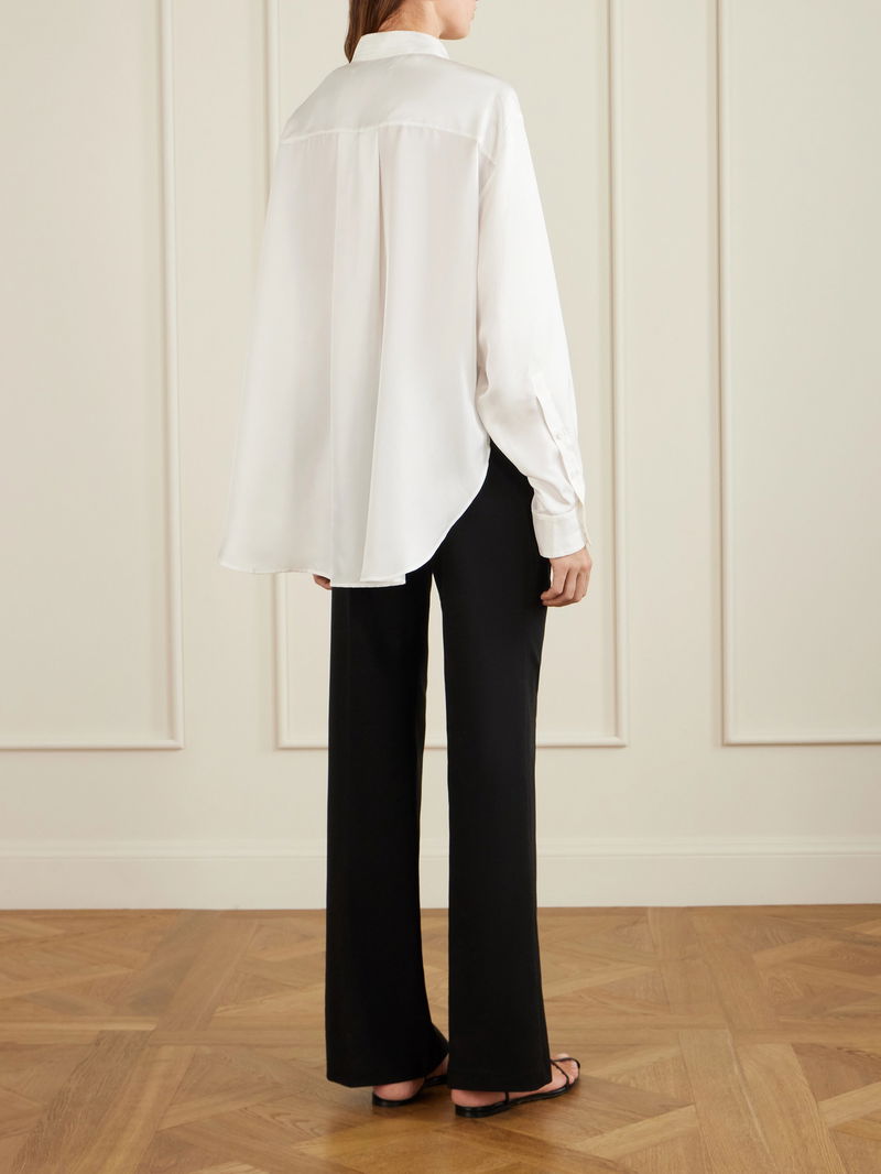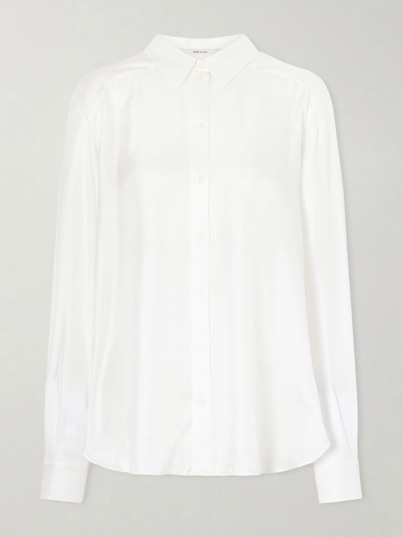 Another Tomorrow's shirt works for a day at the office or brunching with friends, tucked into jeans. Tailored from lightweight silk-twill, it has a pointed collar and box pleat at the back. Wear it with a handful of buttons undone on relaxed days.