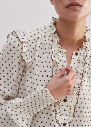 Blouse, Cotton, Embroidered, Buttoned cuffs, Button fastenings through front, Lightweight, non-stretchy fabric.