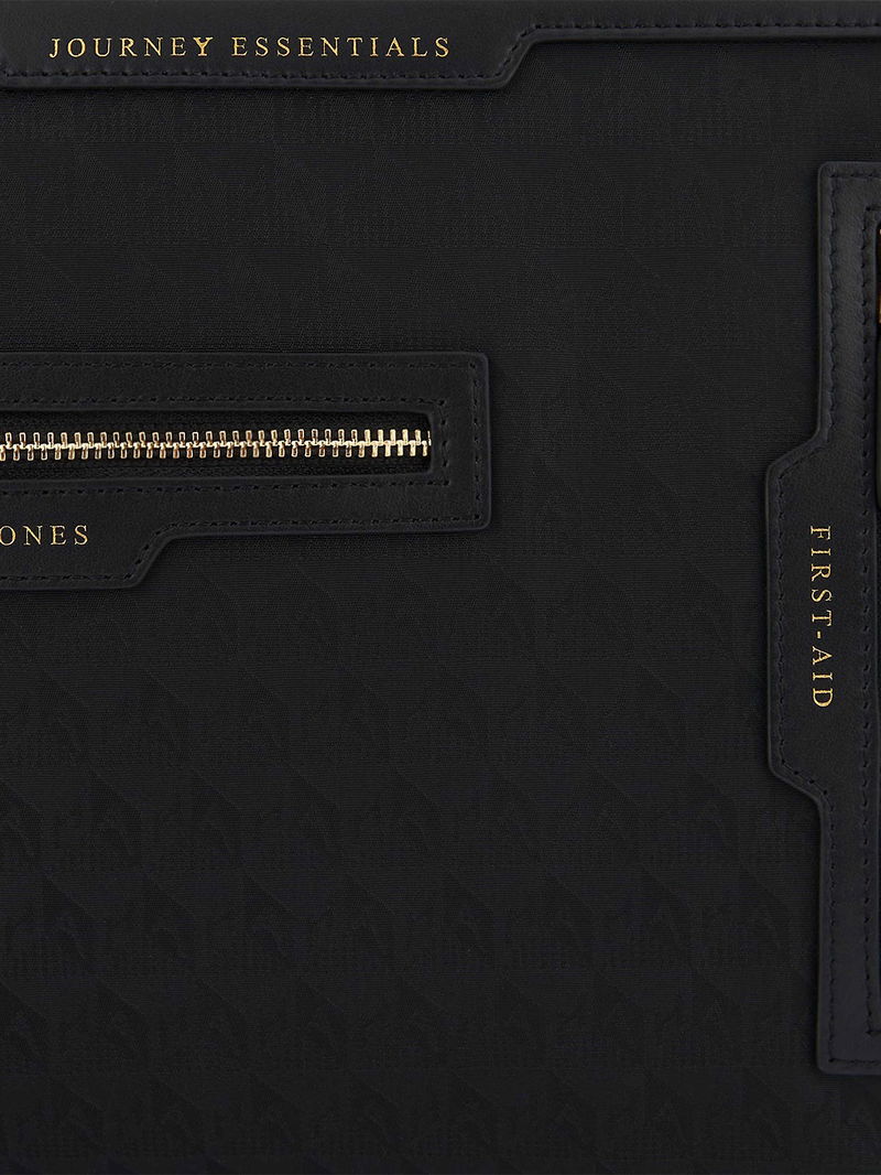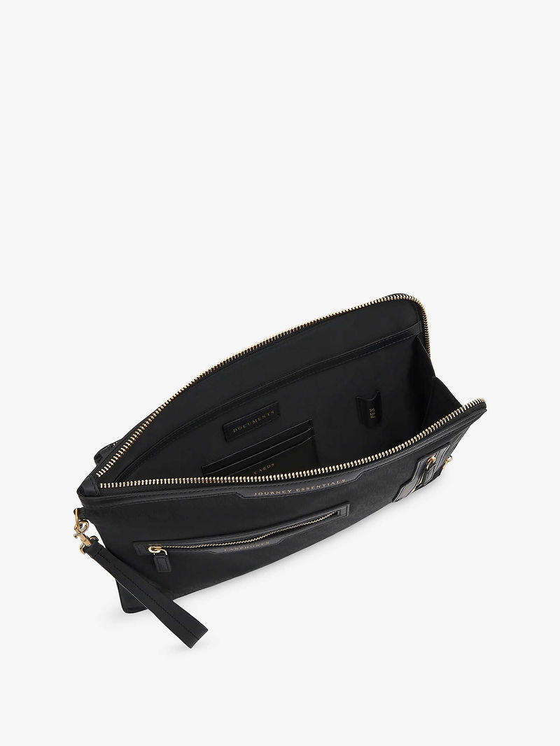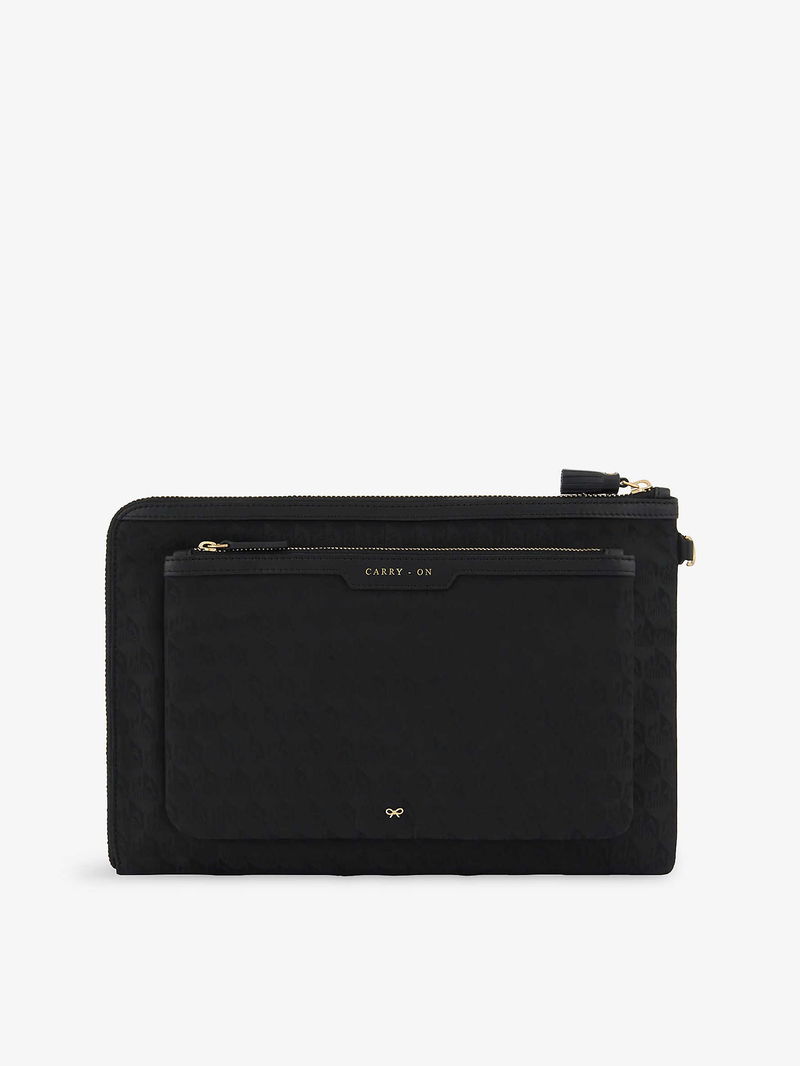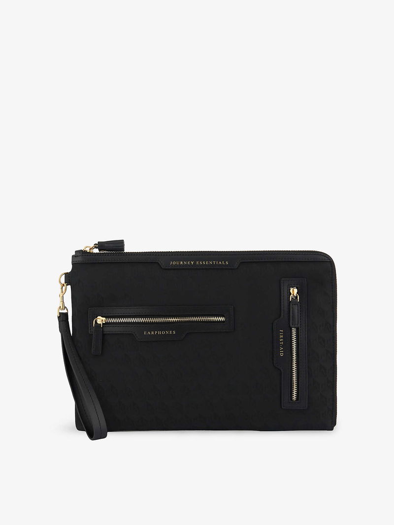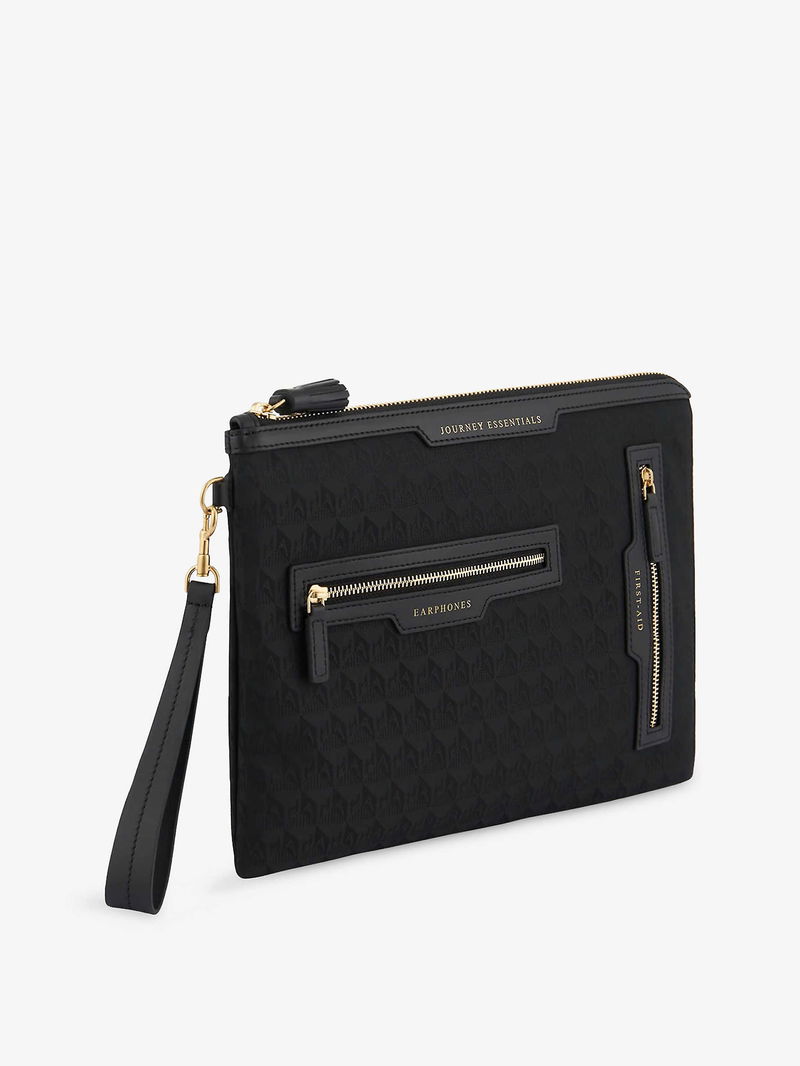 Anya Hindmarch woven pouch. Rectangle shape, detachable wrist strap, jacquard finish, gold foil embossed lettering, two zipped pocket at front, one zipped pocket at back, one main interior compartment, interior large slip pocket, two small slip pockets, pen holder, card compartments.