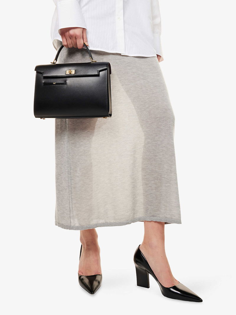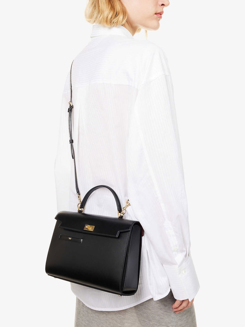 Anya Hindmarch leather top handle bag. Twist-lock closure. Rectangular shape, top handle, detachable adjustable shoulder strap, slip pocket and bow plaque at front, foiled branding at back, all-over smooth leather, four protective feet at base, gold-toned hardware, two main compartments, internal slip and zip pockets, internal phone and card pockets, internal earphones pocket and foiled branding, fully lined.