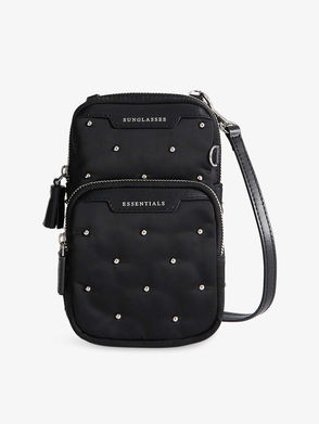 Anya Hindmarch recycled-nylon cross-body bag. Zip fastening Rectangle shape, detachable and adjustable leather strap, three zipped compartments, one tasseled pull, one exterior zip pocket for keys, one exterior pocket for earphones, three interior sections, compartments for wallet, phone, glasses and makeup, leather nameplate, bow logo plaque.