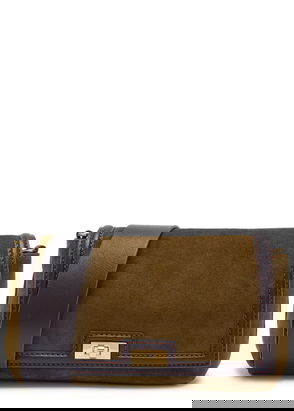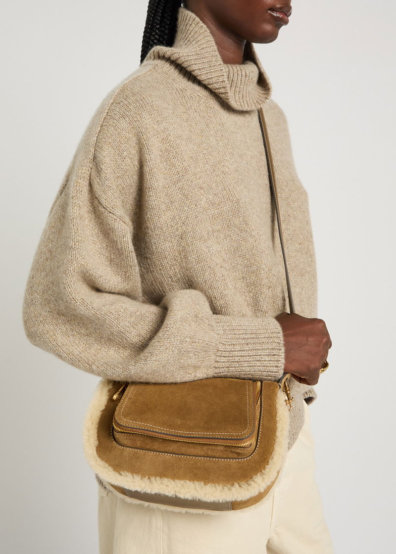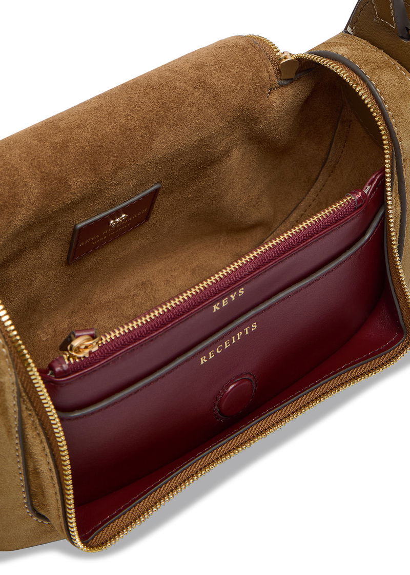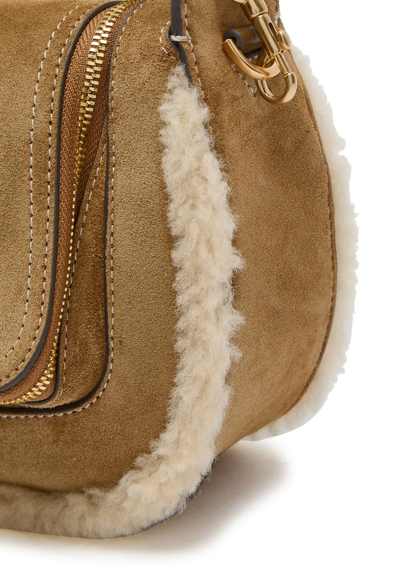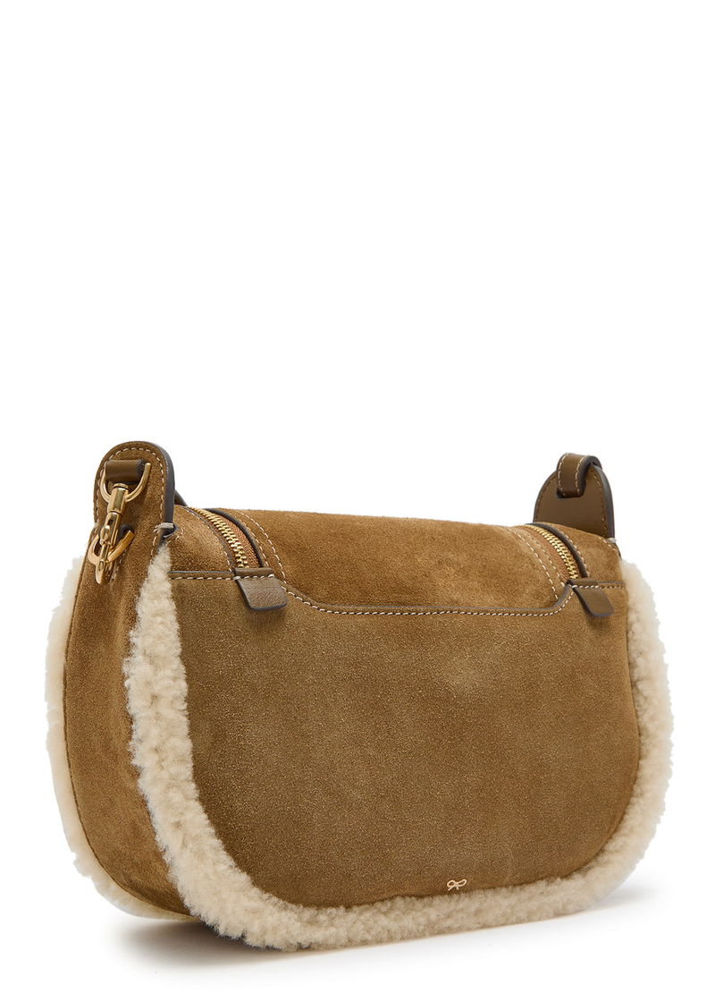 Anya Hindmarch suede cross-body bag. Leather shoulder strap, shearling trims, logo embellishment at back, leather base panel, contrast stitching, internal zip-fastening pocket, internal patch pocket, fully lined.
