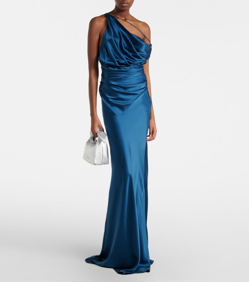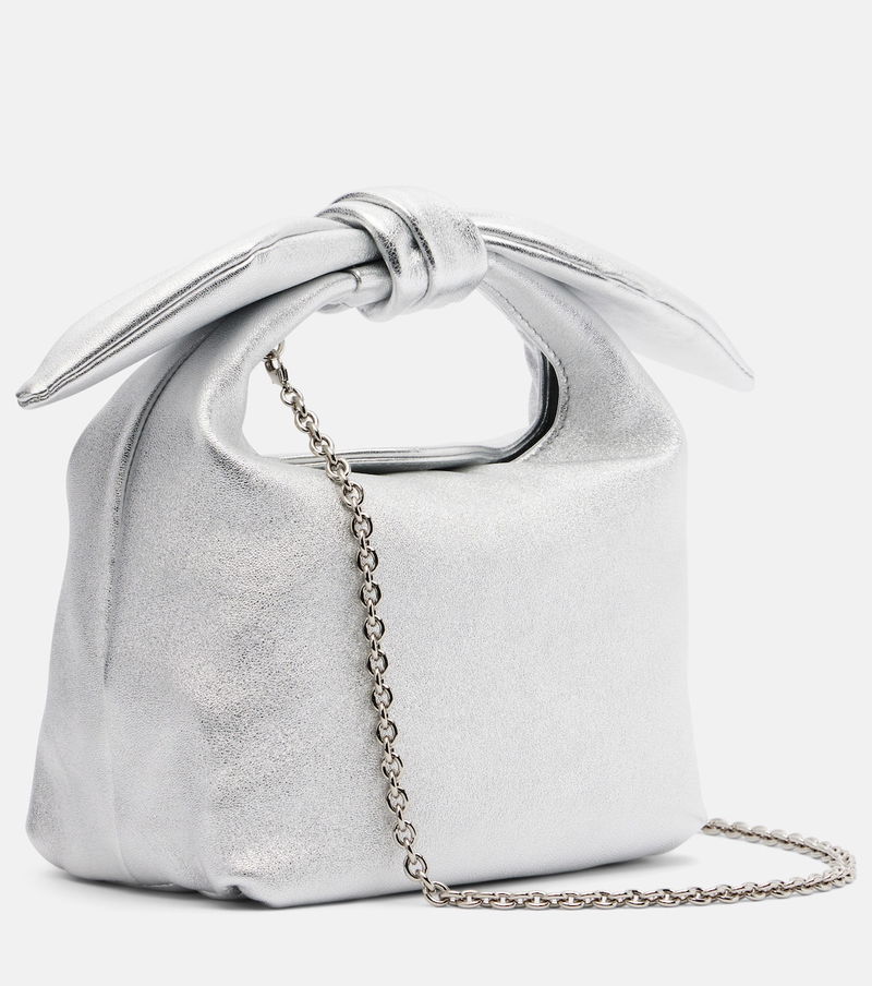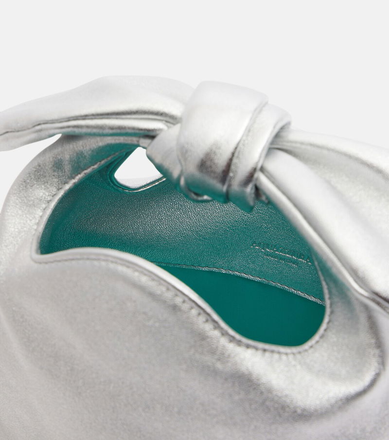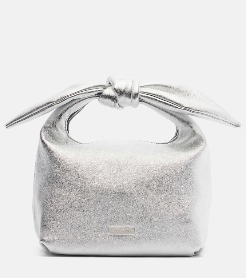 The Bow Tie bag from Aquazzura is presented in a shiny metallic leather construction, complemented by a silver-toned chain strap. This Mini-sized design features a knotted top handle for a distinctive finish.