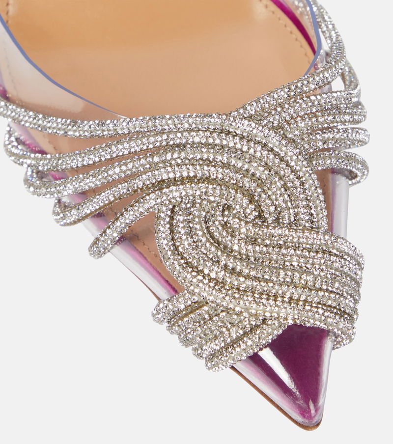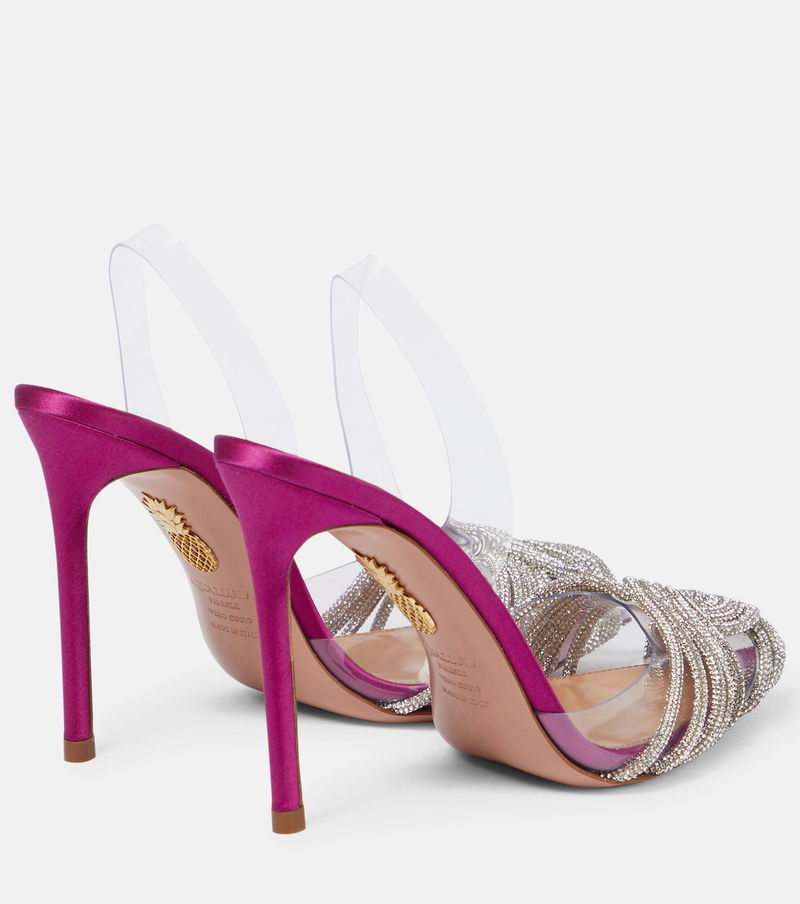 Aquazzura's Gatsby slingback pumps will be standout party fixtures. They're embellished with crystal swirls – illuminated against PVC toecaps – and framed with lustrous pink satin.