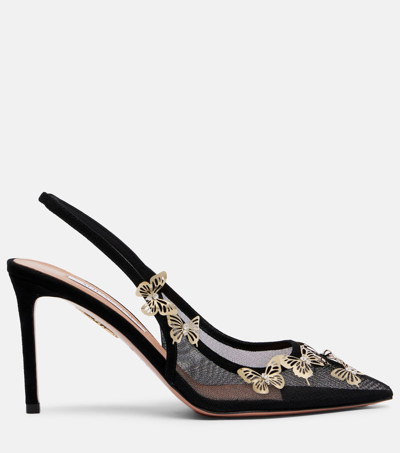 Aquazzura mixes a refined European aesthetic with modern American sensibility and Latin flair. You’ll find its glamorous, ultra-feminine handwriting on everything from elegant flat leather sandals to metallic high heels, sculptural boots and signature 105 pumps in crystal embellished velvet.