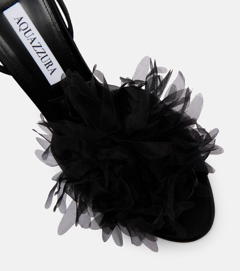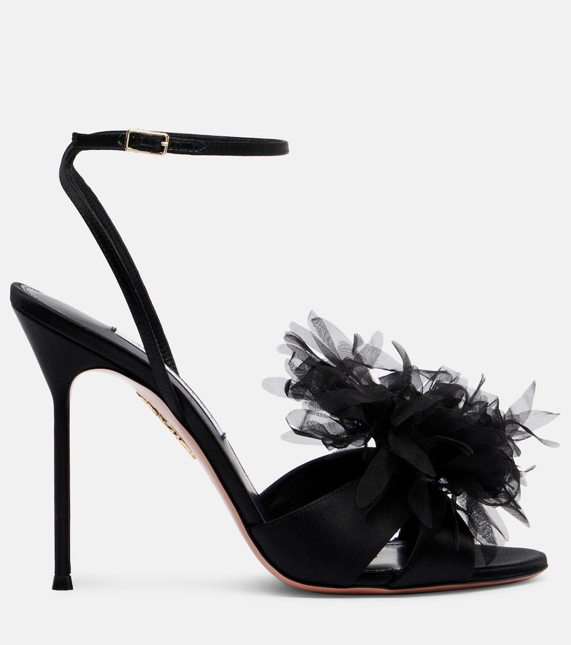 A single Aquazzura pair can include over 30 components, each of which is hand-assembled by skilled artisans. The Poème satin sandals feature a slingback silhouette with 105mm heels and organza floral details on the upper straps.