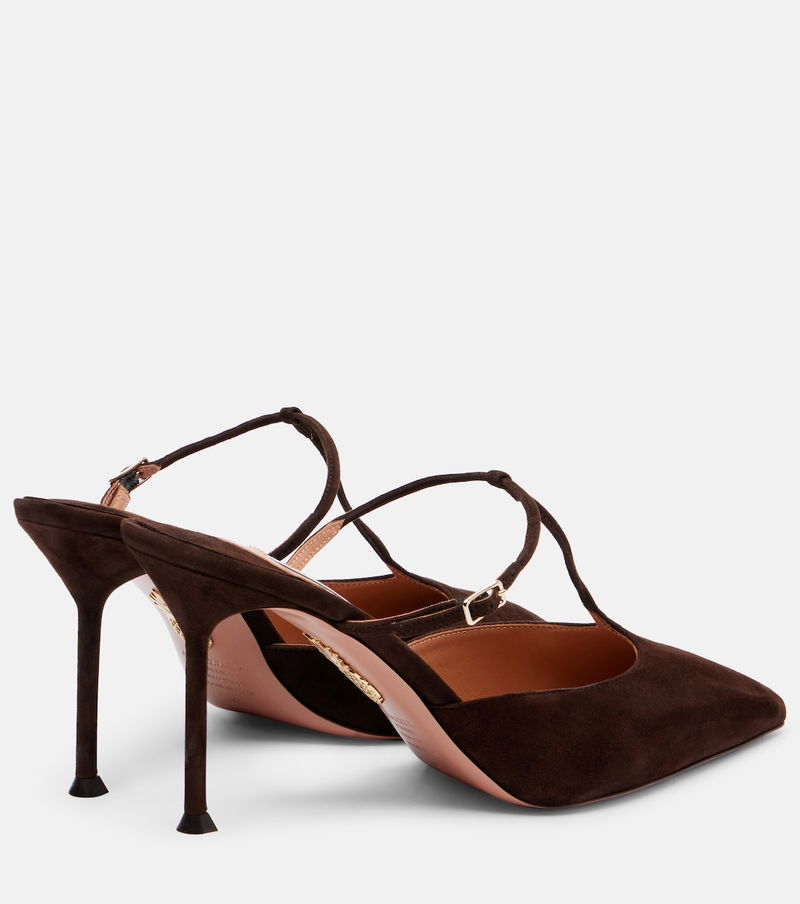 A single Aquazzura pair can include over 30 components, each of which is hand-assembled by skilled artisans. The Sorbonne mules feature a suede construction with 85mm heels and thin upper straps.
