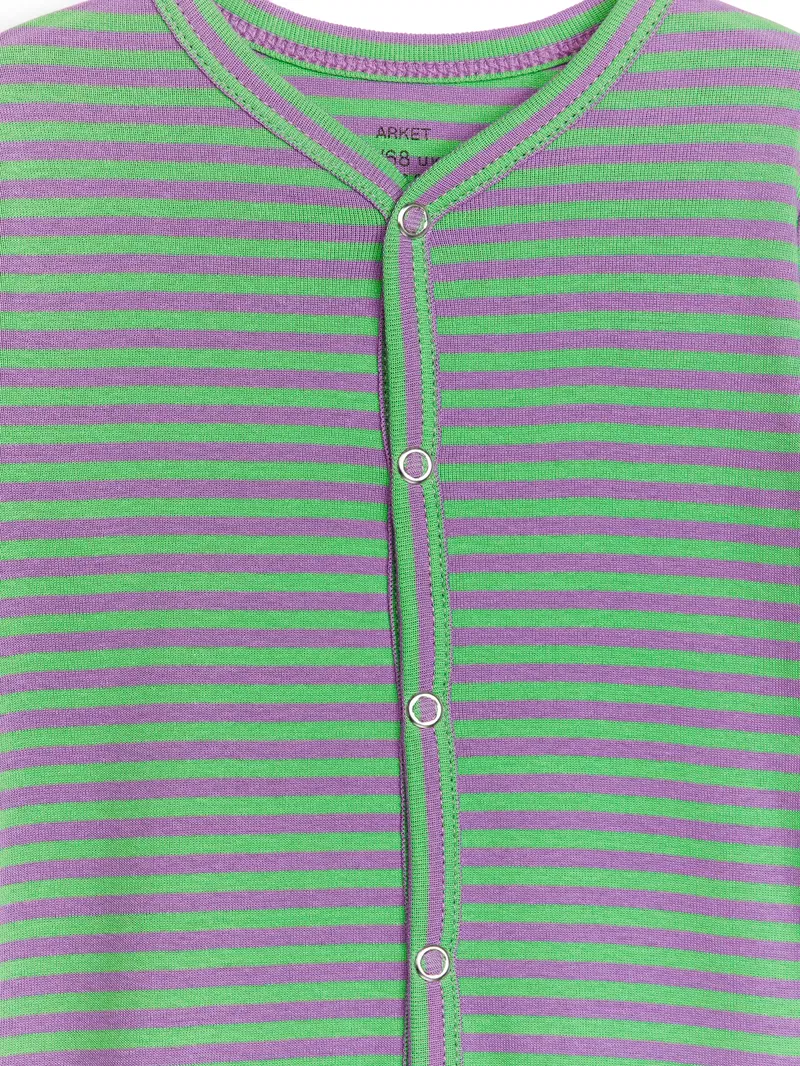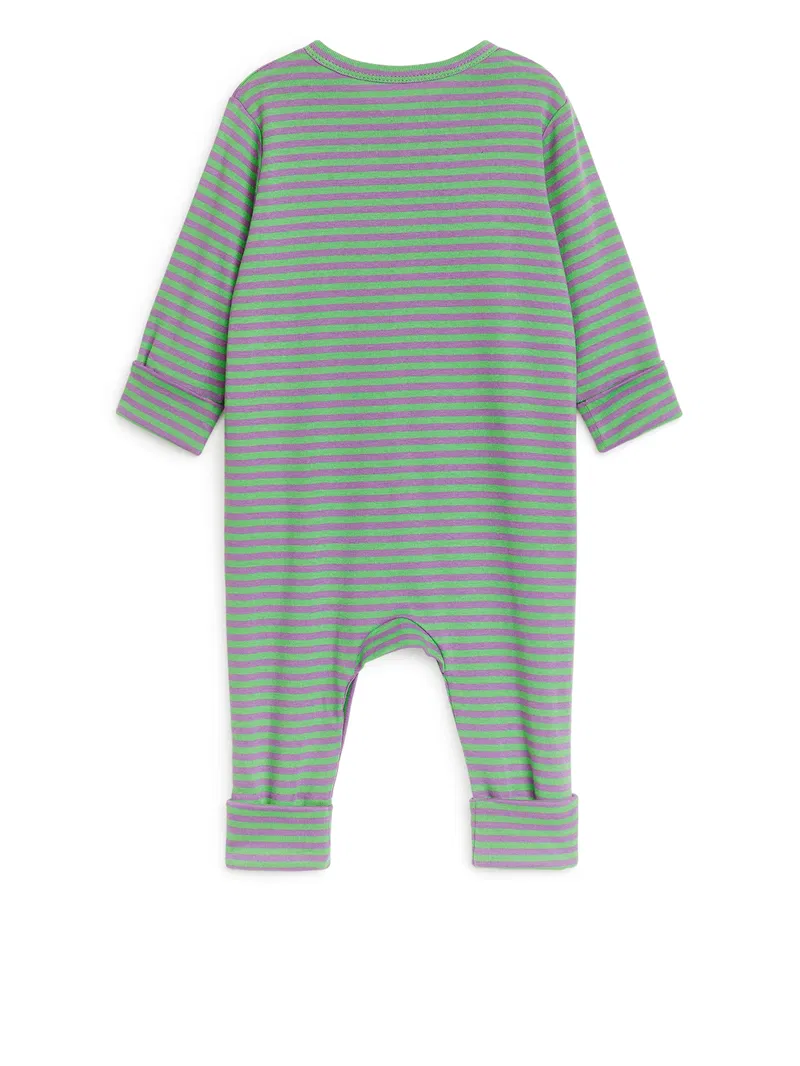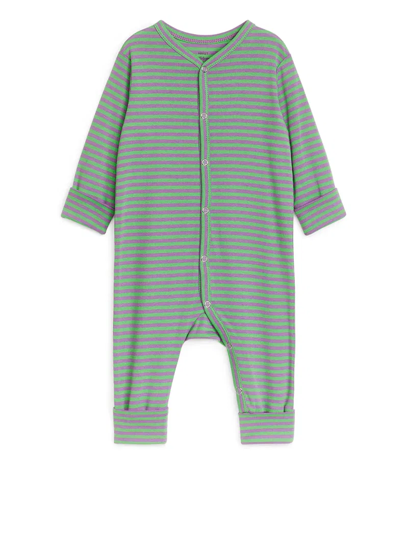 The ribbed jersey fabric used for this pyjama is both soft and stretchy, with extra soft seams for comfortable wearing. Made of organic cotton with snap buttons from top to toe for easy dressing. Foldable cuffs at sleeve and leg opening.