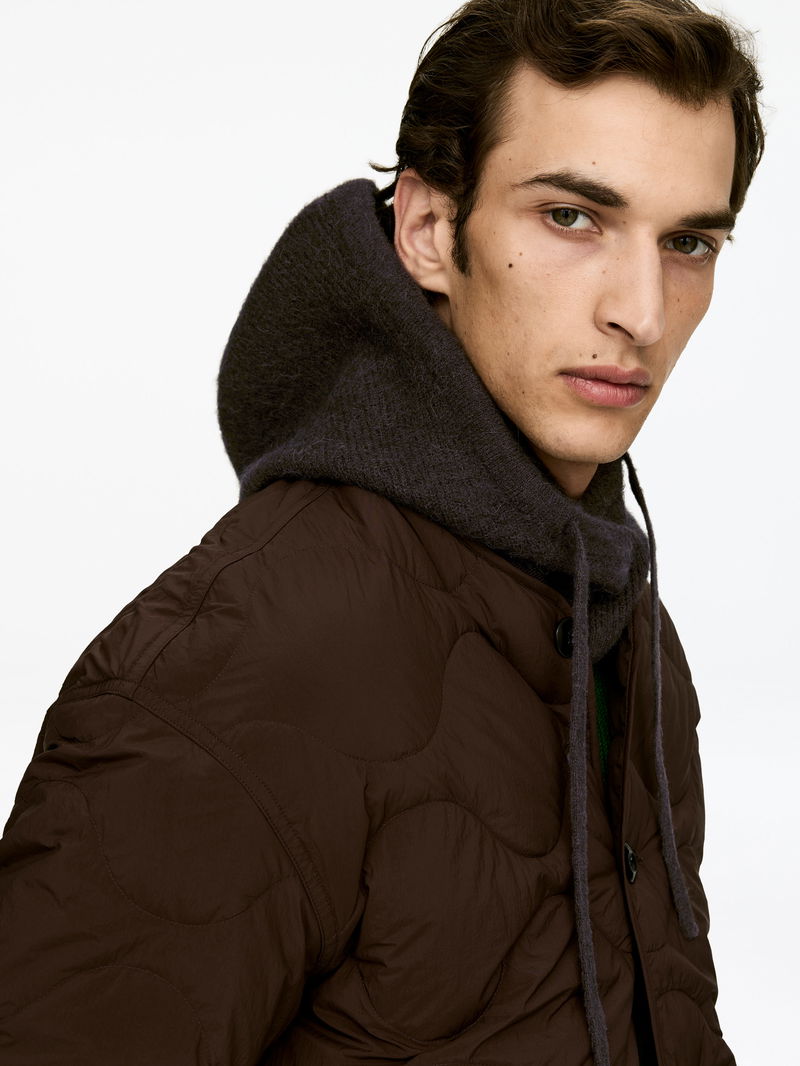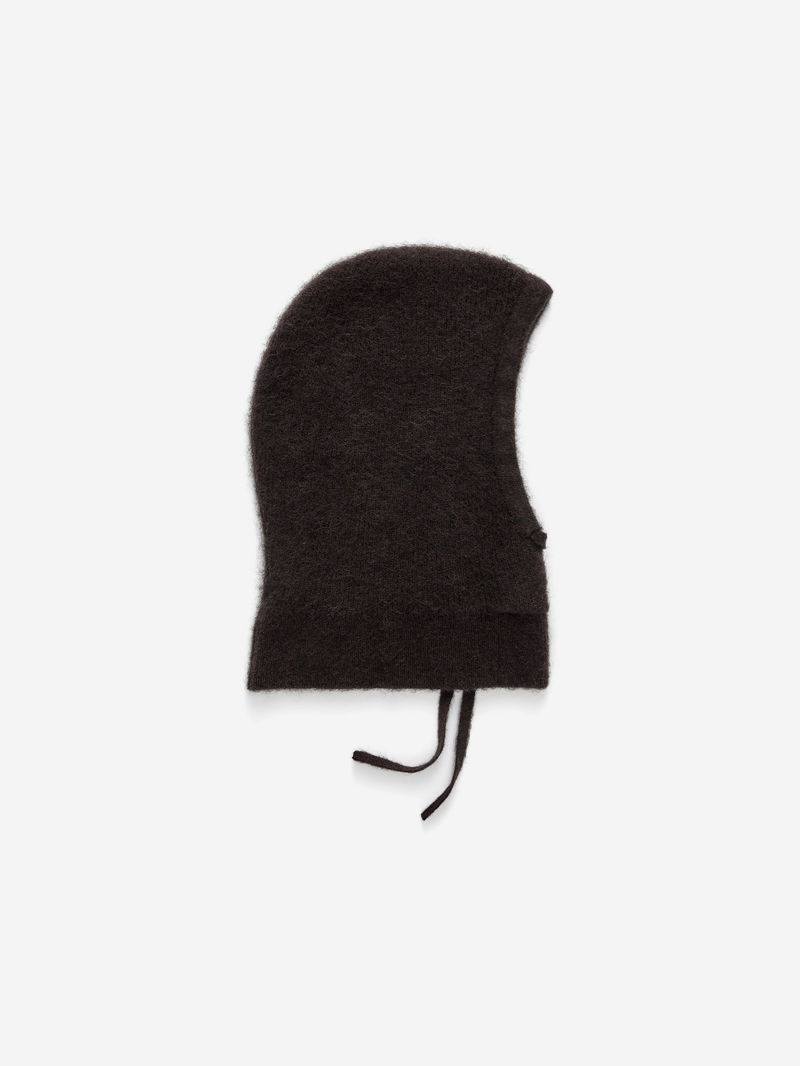 Knitted hood in a soft alpaca and wool blend. Designed in a loose fit and detailed with drawstrings.