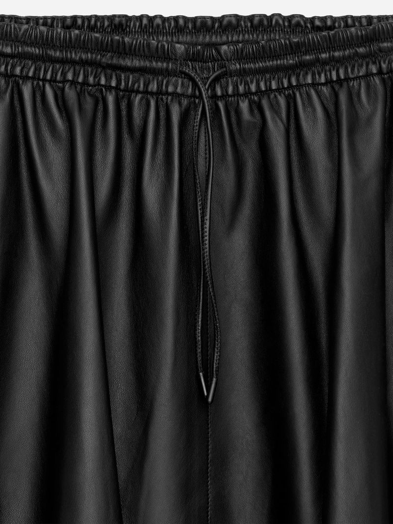 A sculpted barrel-shaped skirt cut from smooth chrome-free leather, defined by a sport-inspired elasticated drawstring waist and clean side pockets.