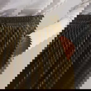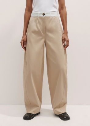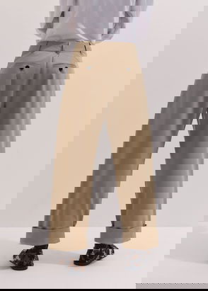 These mid-waist chinos are cut with slightly barrel-shaped legs detailed with knee darts. A casual style made of organic cotton. Detailed with herringbone tabs at both sides enable adjustment of the waist, slanted pockets at front and one welt pocket at the back.