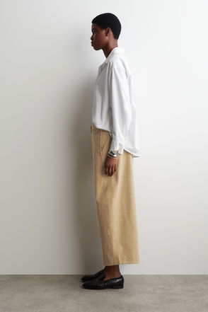 Barrel-leg poplin trousers with elastics and dart detailing at waist. A mid-rise style with side pockets and a relaxed fit.