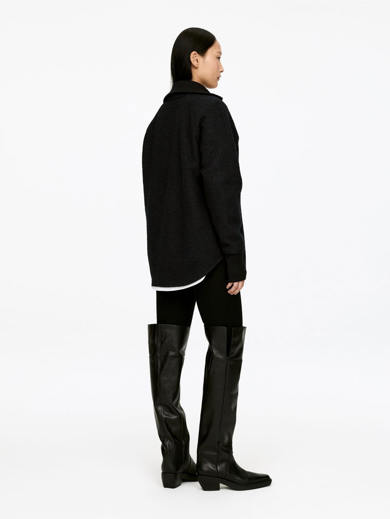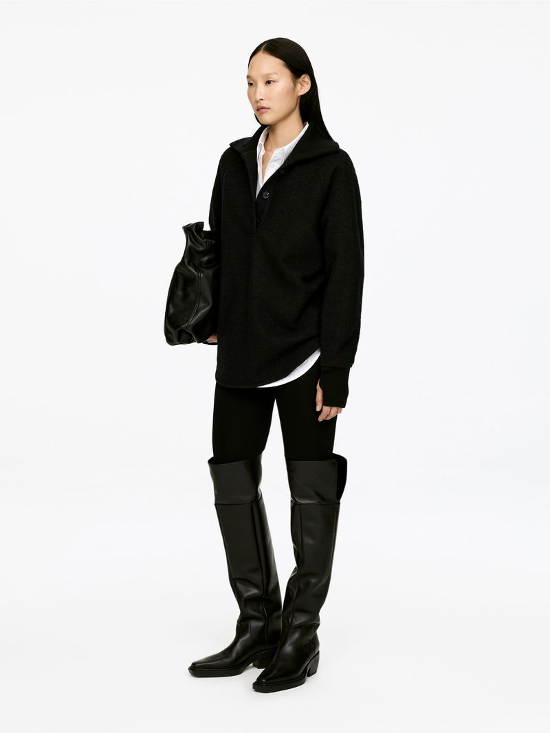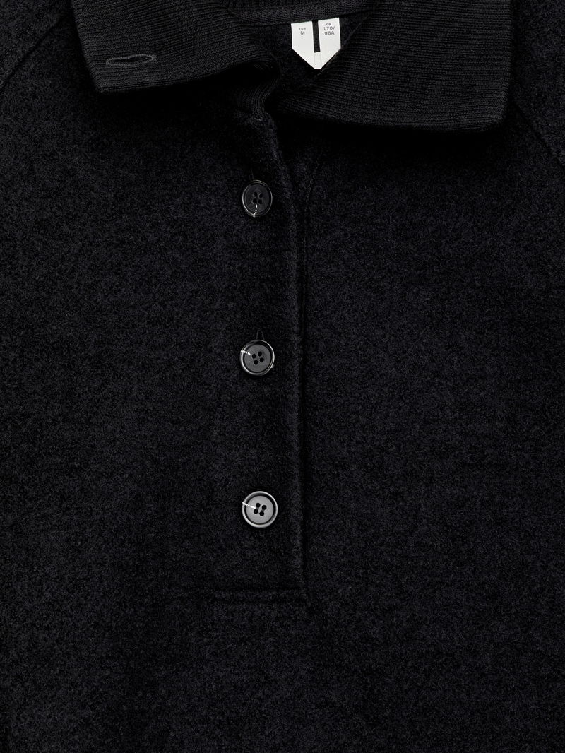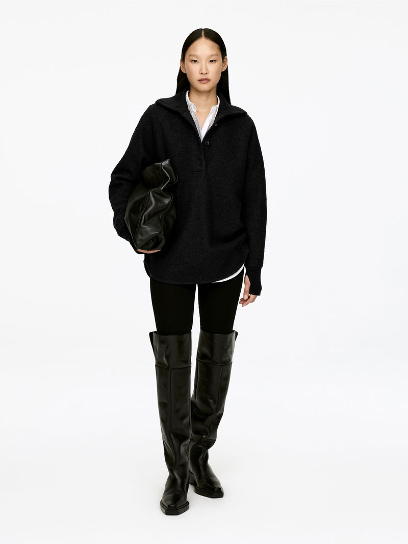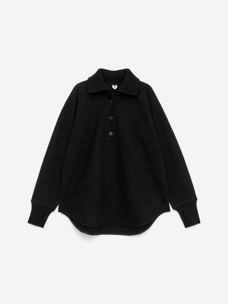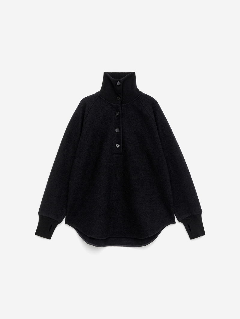 Jumper in a boiled wool and cotton blend. Half placket with button fastening and a double-layer ribbed collar. Designed with raglan sleeves and wide cuffs with thumbholes.