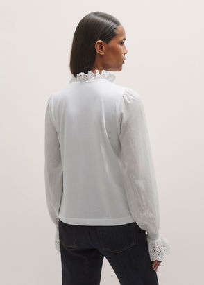 Cotton blouse with broderie anglaise detailing and lightly puffed sleeves. Finished with babylock edges at the hem and gathered sleeve endings.