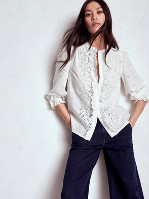 Cut from a crisp cotton fabric featuring a floral broderie anglaise, this blouse is an airy style with a relaxed fit. The gatherings at the shoulders add a beautiful volume to the short sleeves. Detailed with a rounded neckline and a V-shaped opening at front.