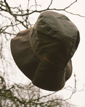 Bucket hat crafted from cotton. Self-tie strings in shell material. Topstitched brim.