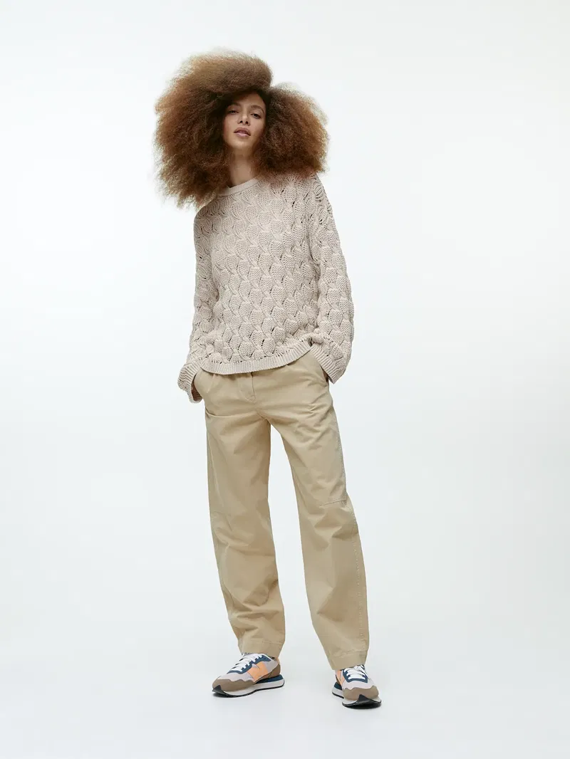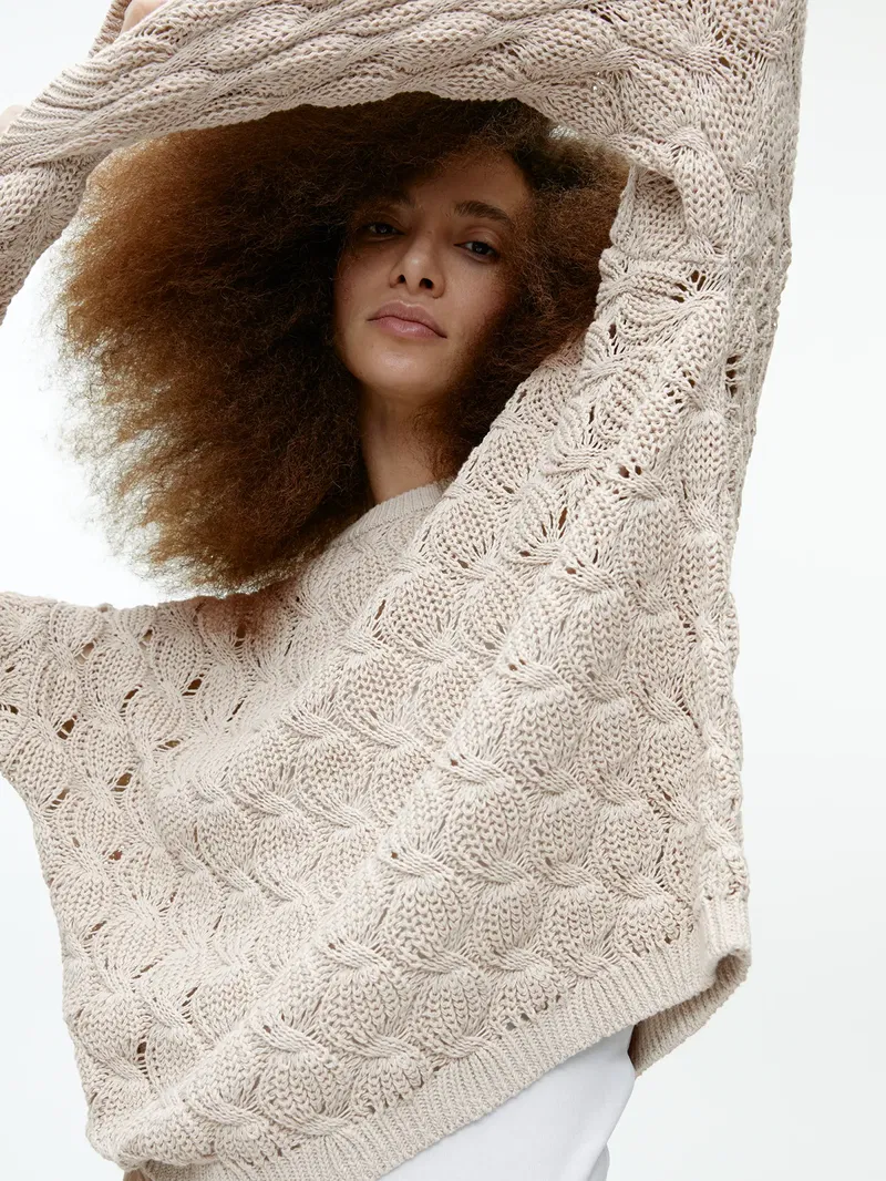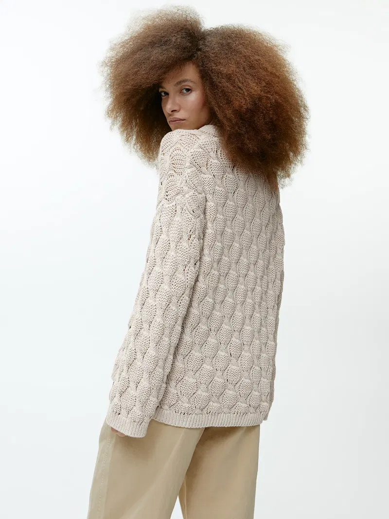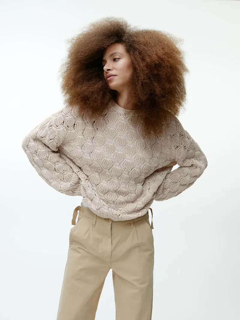 Designed for a relaxed fit, this jumper features a cable-knitted pattern with ribbed details. Made from a blend of recycled and organic cotton.