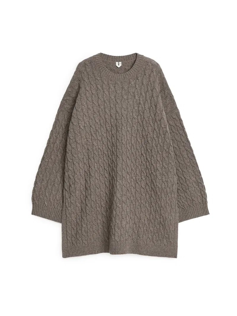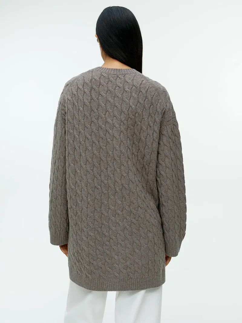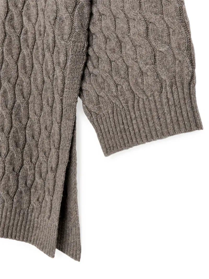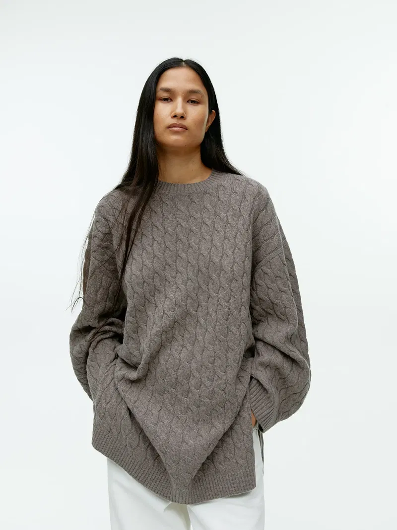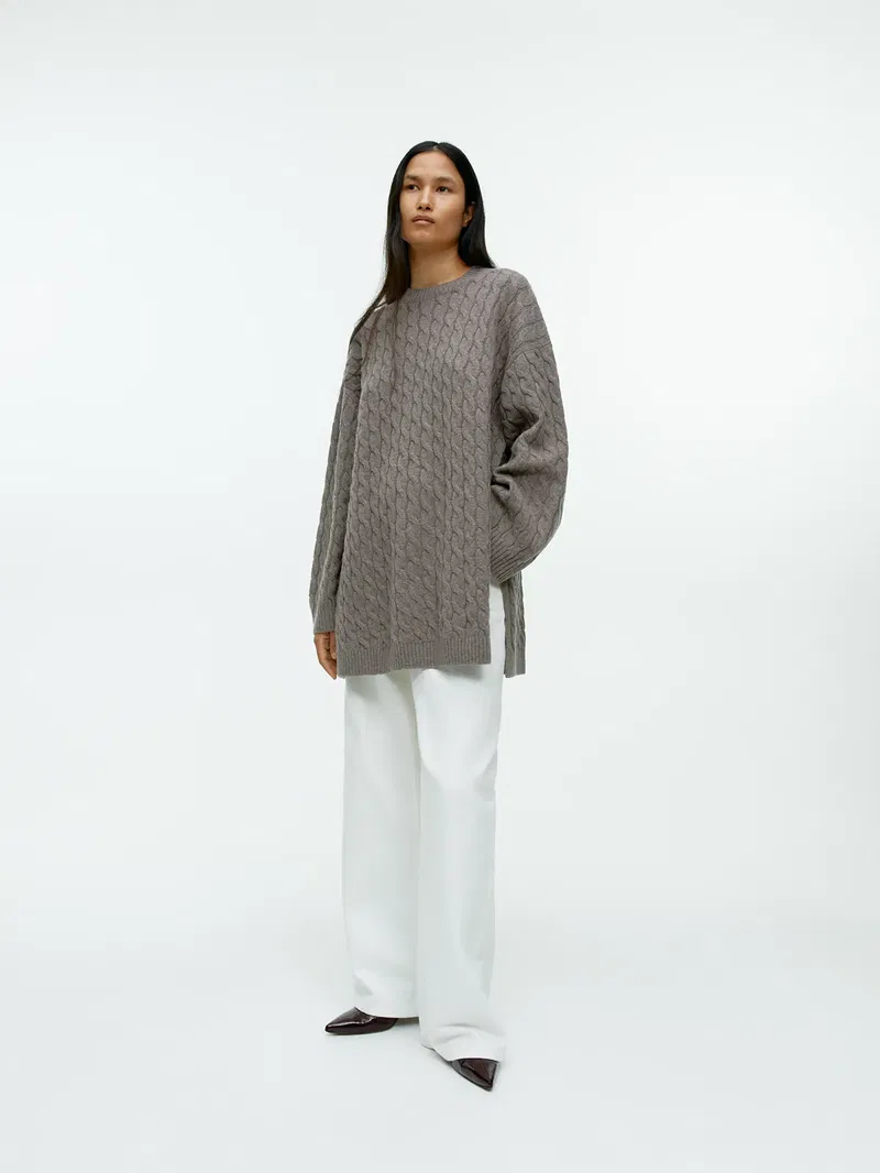 Cable-knit jumper with a loose silhouette and dropped shoulders. Styled with slits on sides and ribbed trims.