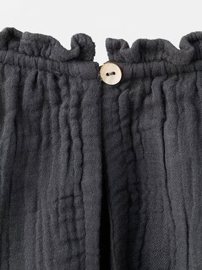 Sewn from a chambray made of organic cotton, this blouse offers soft and lightweight comfort. Cut with a slight A-line silhouette, it is detailed with elastics at chest and at end of sleeves for decorative gatherings. Key hole opening at the back with a single button at neck.