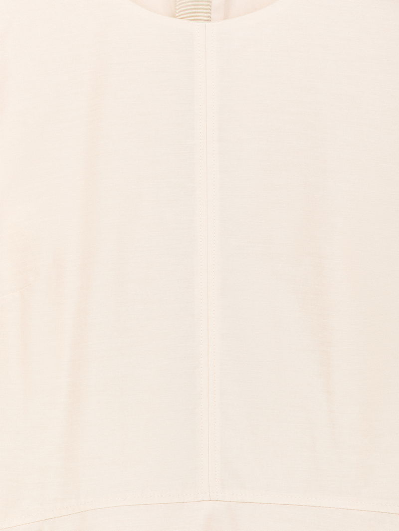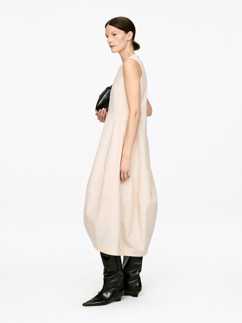 Sleeveless dress crafted from a cotton blend. The top features a central topstitch and a zip at the centre back. The skirt has a cocoon shape with a cut line finished with topstitching. Fully lined.