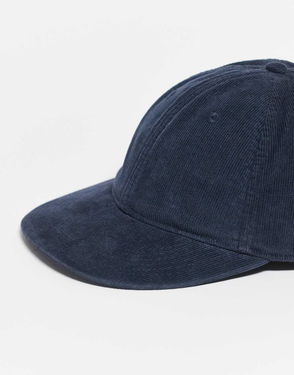 Corduroy cap in a six-panel baseball style featuring a flat peak. Adjustable strap with a metal buckle.