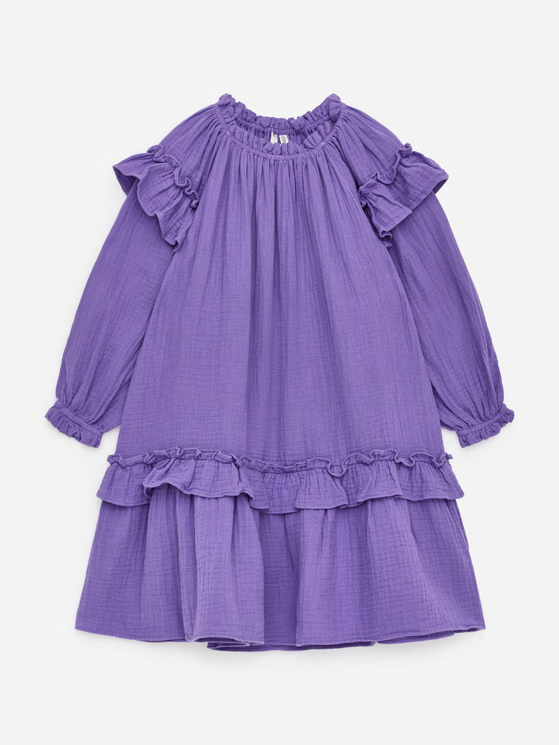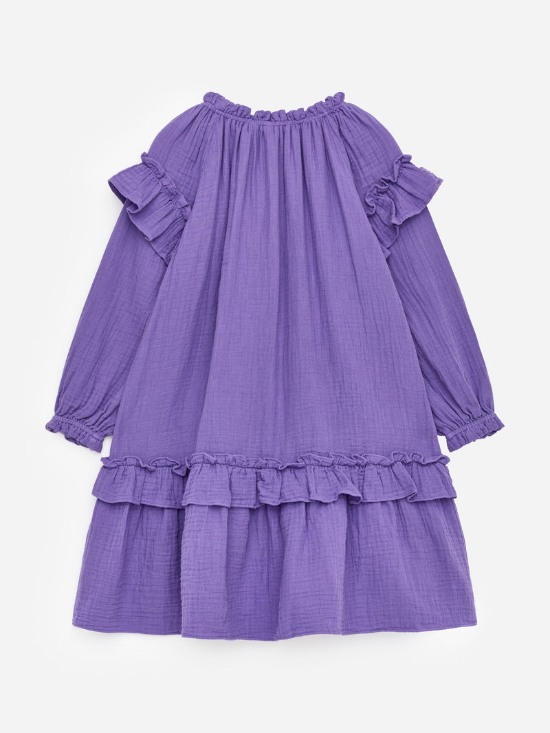 Soft muslin dress crafted from pure cotton, featuring gathers and frills. Designed for a relaxed fit.