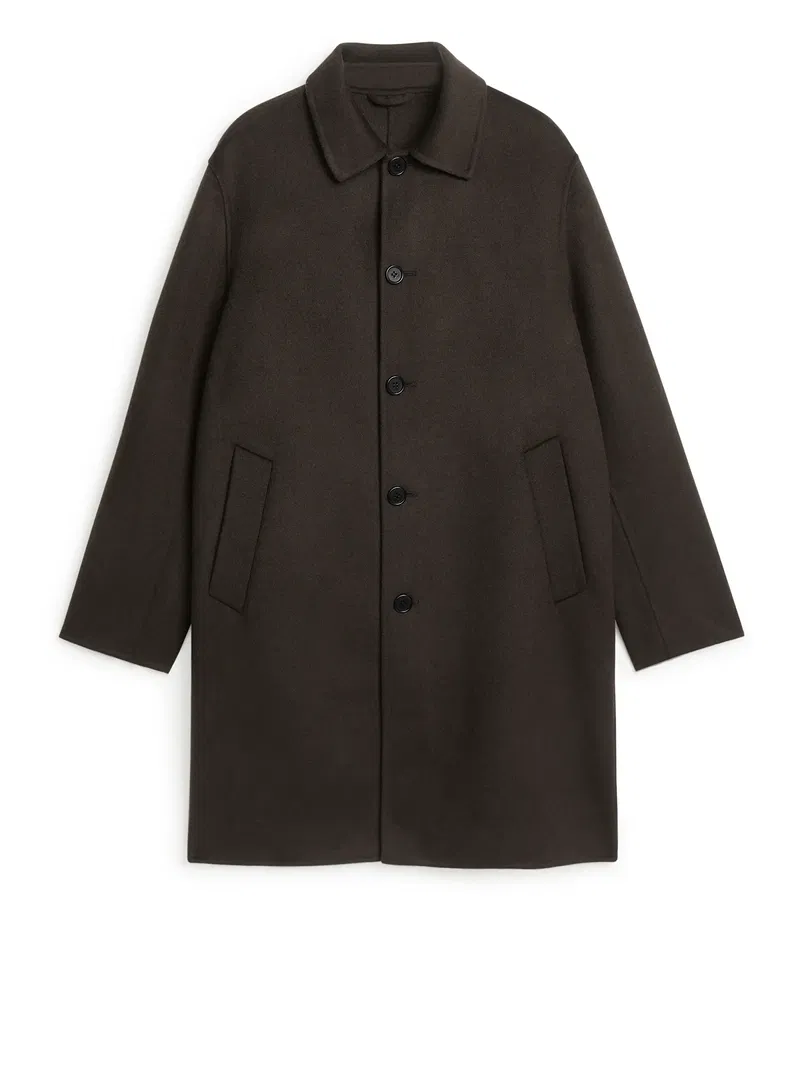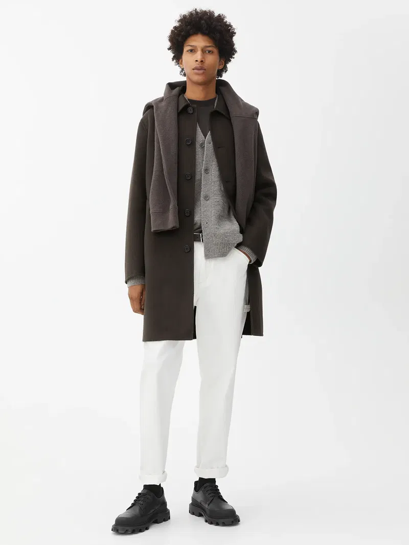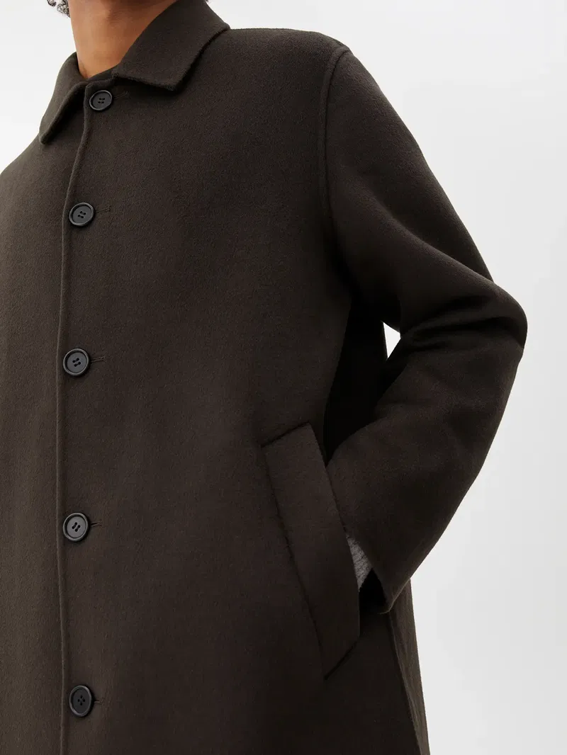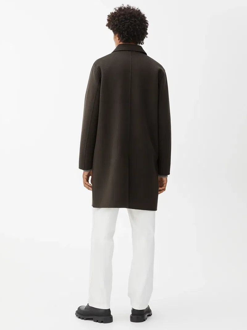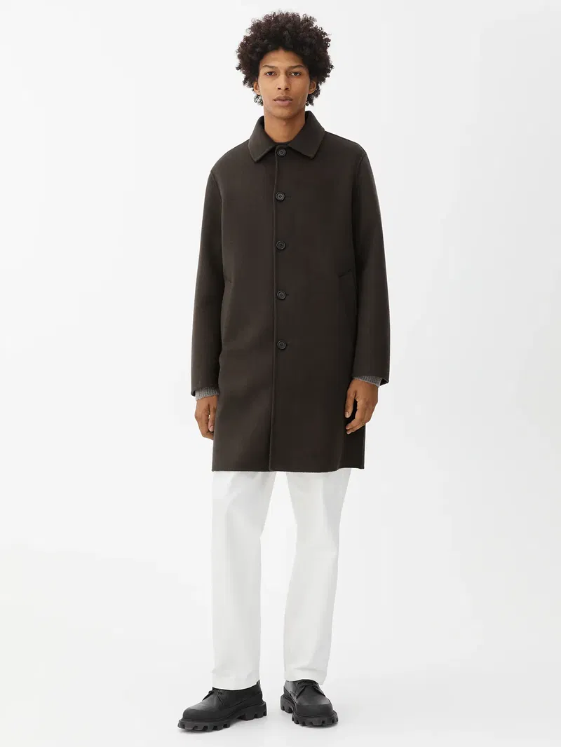 Crafted from exclusive double-face wool blend fabric, this coat is carefully finished without any visible stitching. The fabric is made from a warm and durable mix of certified, traceable wool from non-mulesed sheep, and recycled polyester. Cut in a regular fit that falls just above the knee. The clean, unlined design is enhanced with a plain button closure, cut-and-sew pockets, and a simple spread collar.