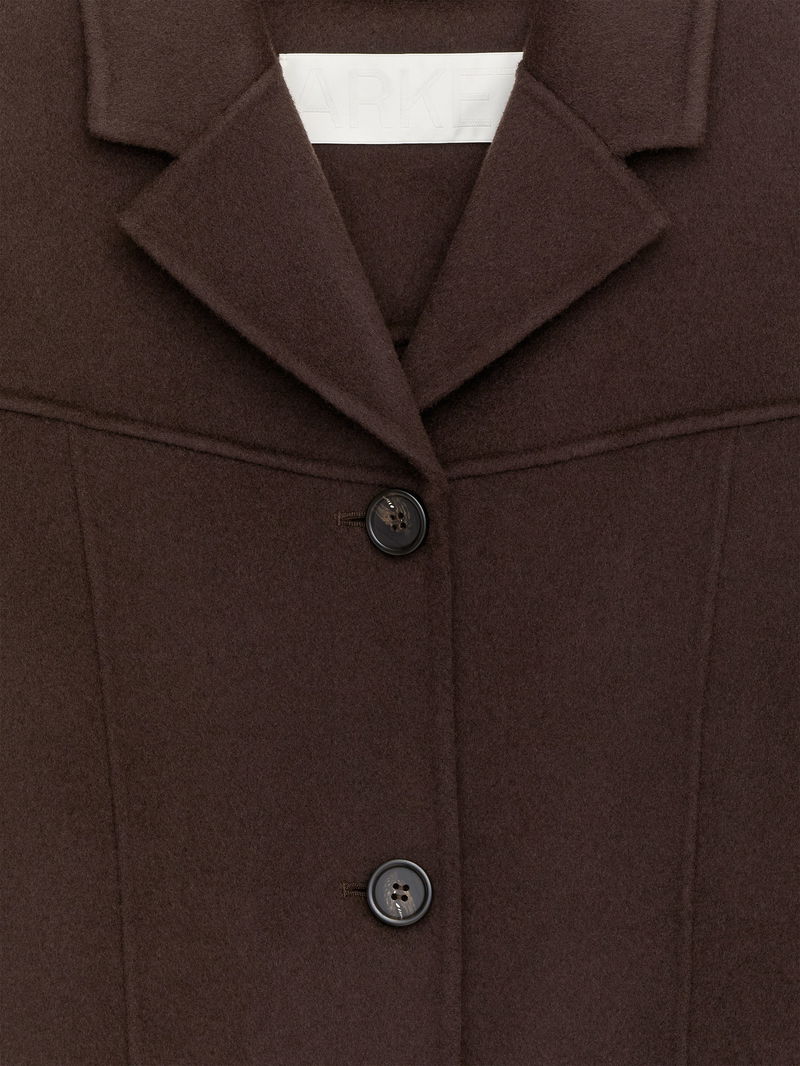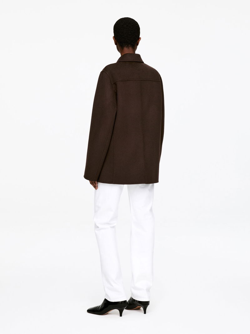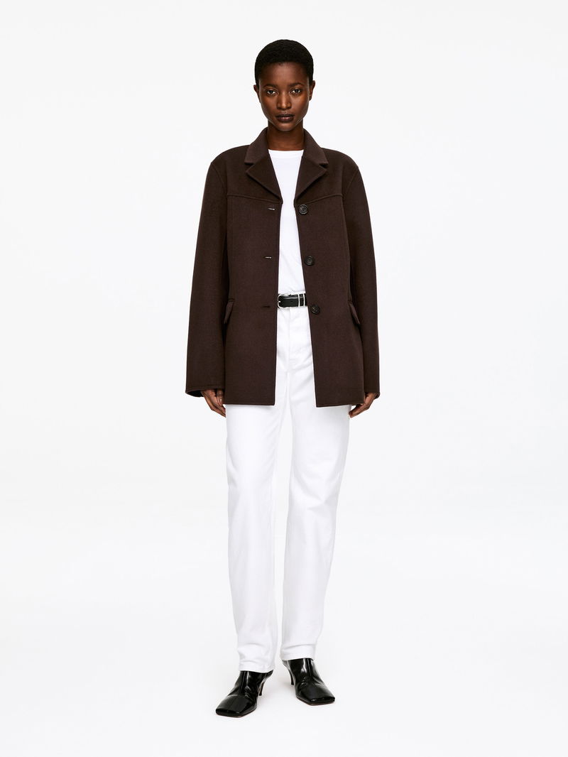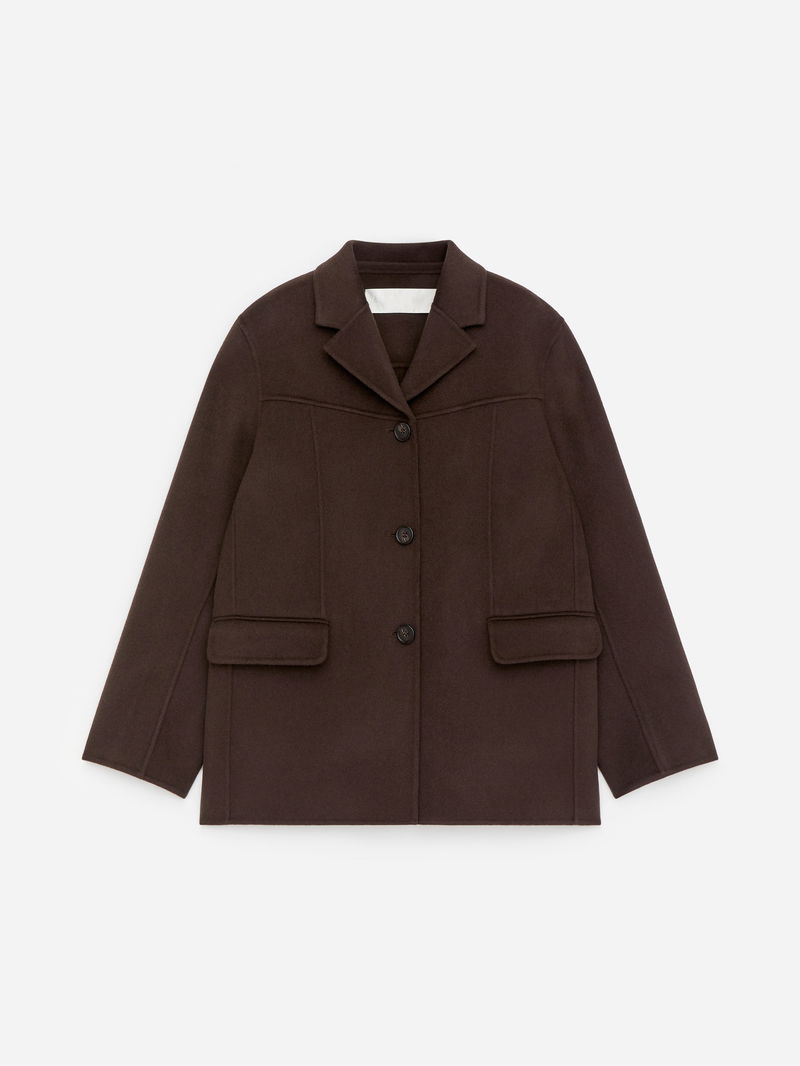 Crafted from double-face wool, this single-breasted blazer offers a refined, minimalist look. Finished with a three-button closure, subtle darting, and flap welt pockets.