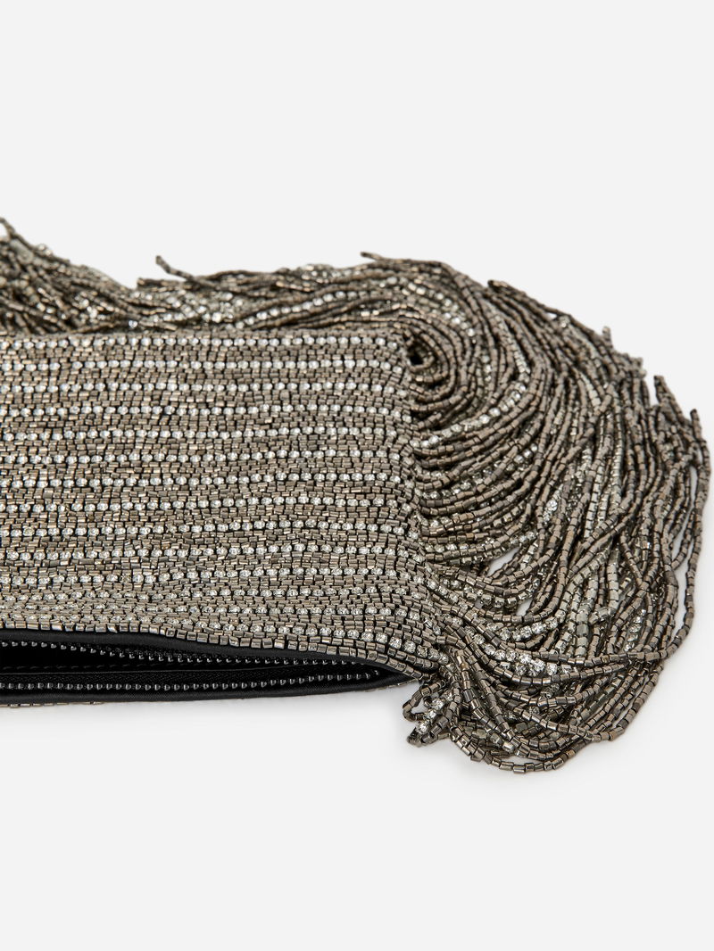 Clutch bag embellished with beads and rhinestones. One side features a beaded and rhinestoned fringe. Zip fastening with a detachable shoulder strap inside.