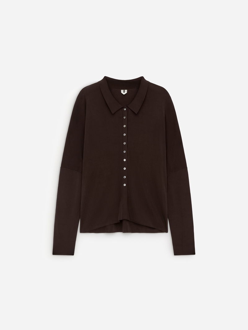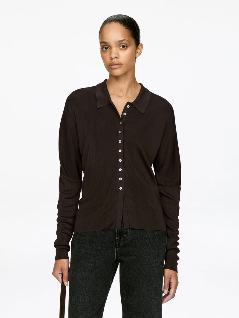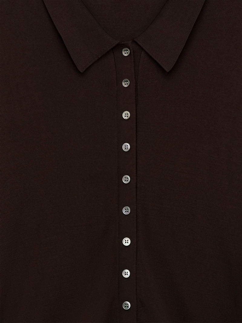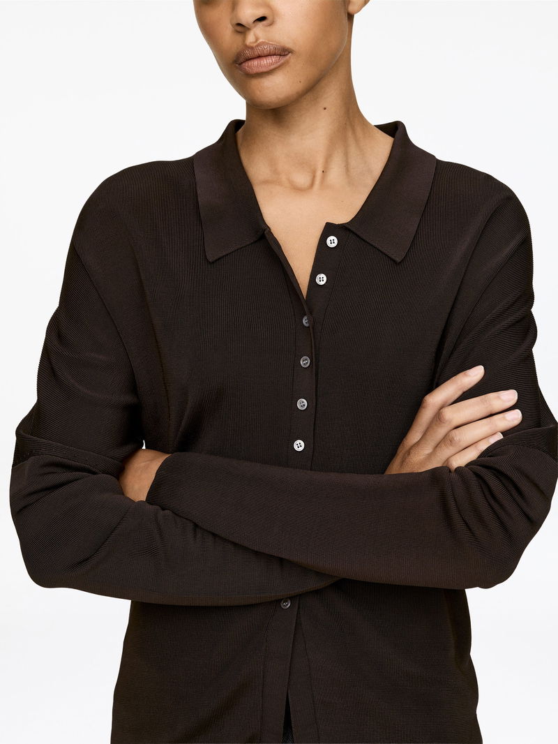 Fine-knitted shirt made of viscose, featuring French shoulders, a button closure, and a low classic shirt collar.