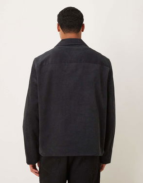 A workwear inspired jacket crafted from a fluid twill weave made of recycled polyester. A cropped, straight-cut style detailed with a banded collar and stitching in contrasting colour. Zip closure and two patch pockets at front.