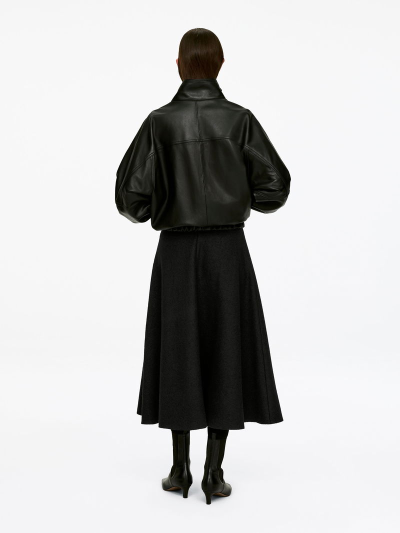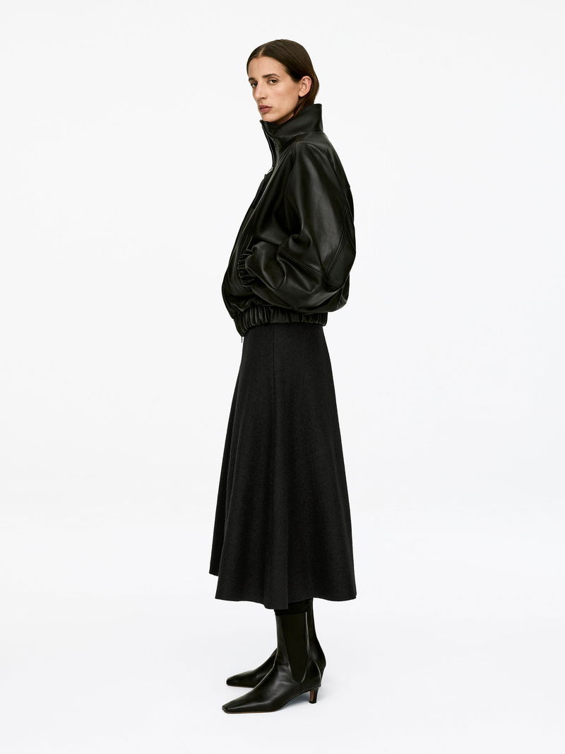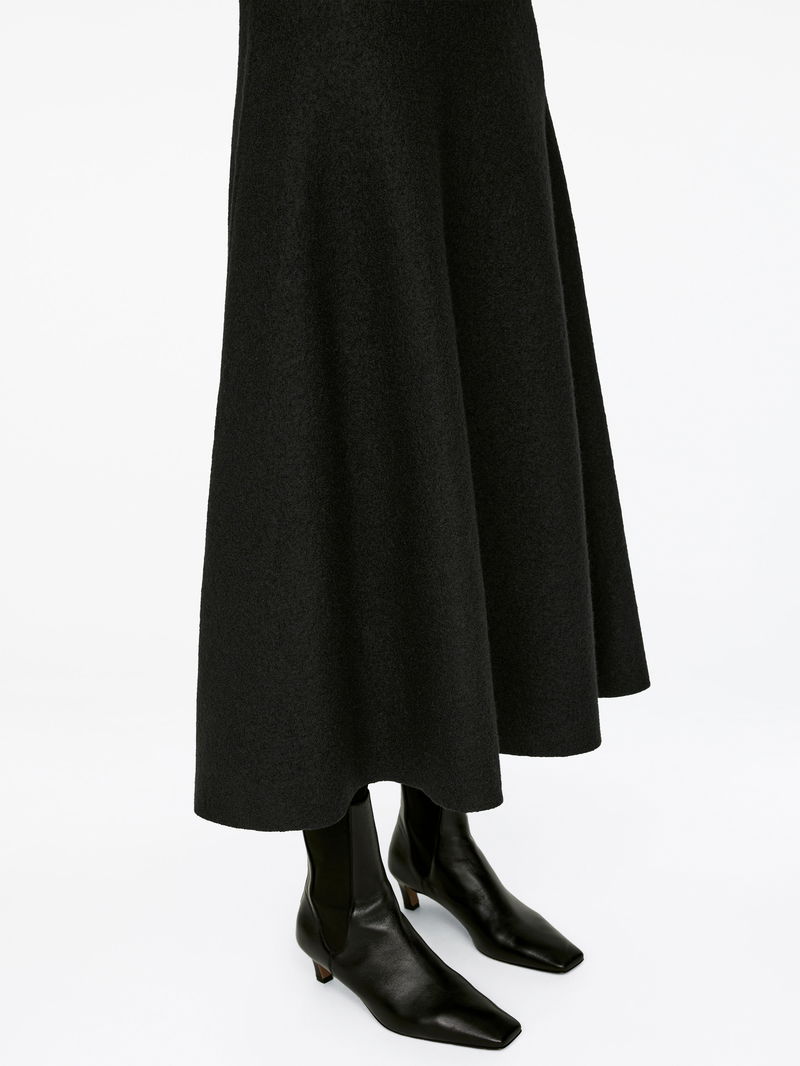 Full circle skirt crafted from wool. An ankle-length style detailed with a zip and hook-and-bar closure at the centre back and a raw edge at the hem.