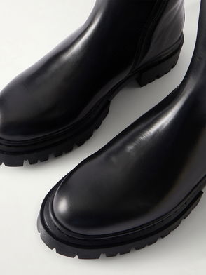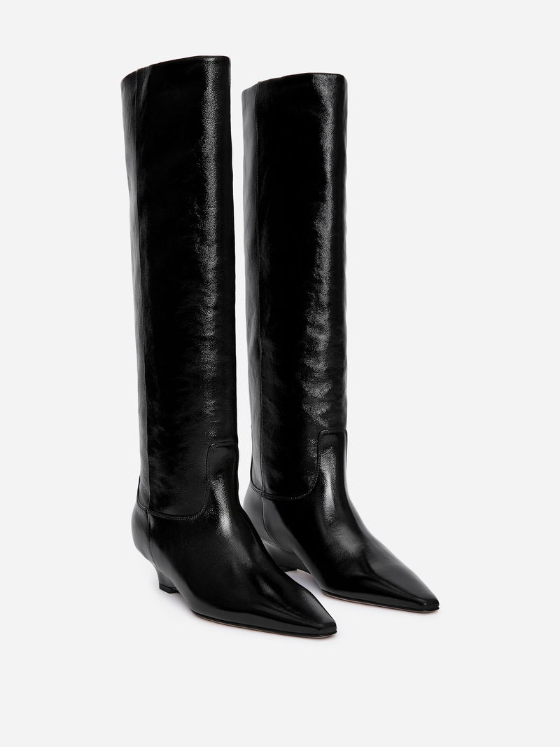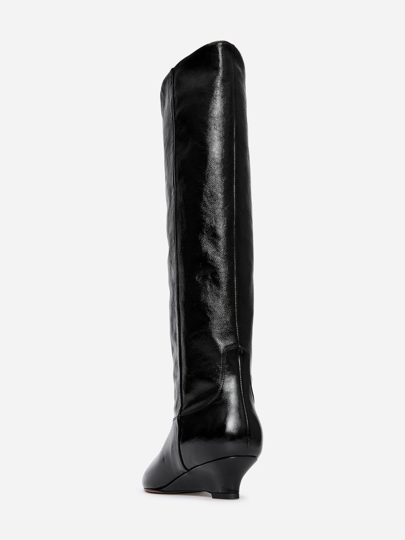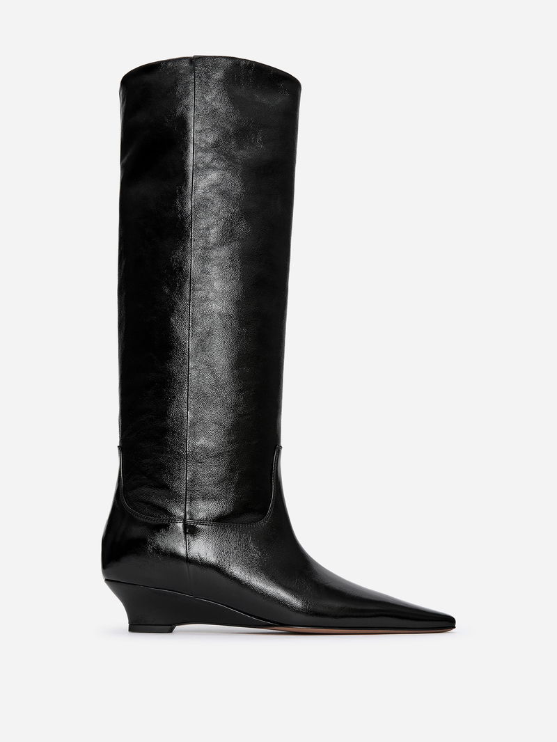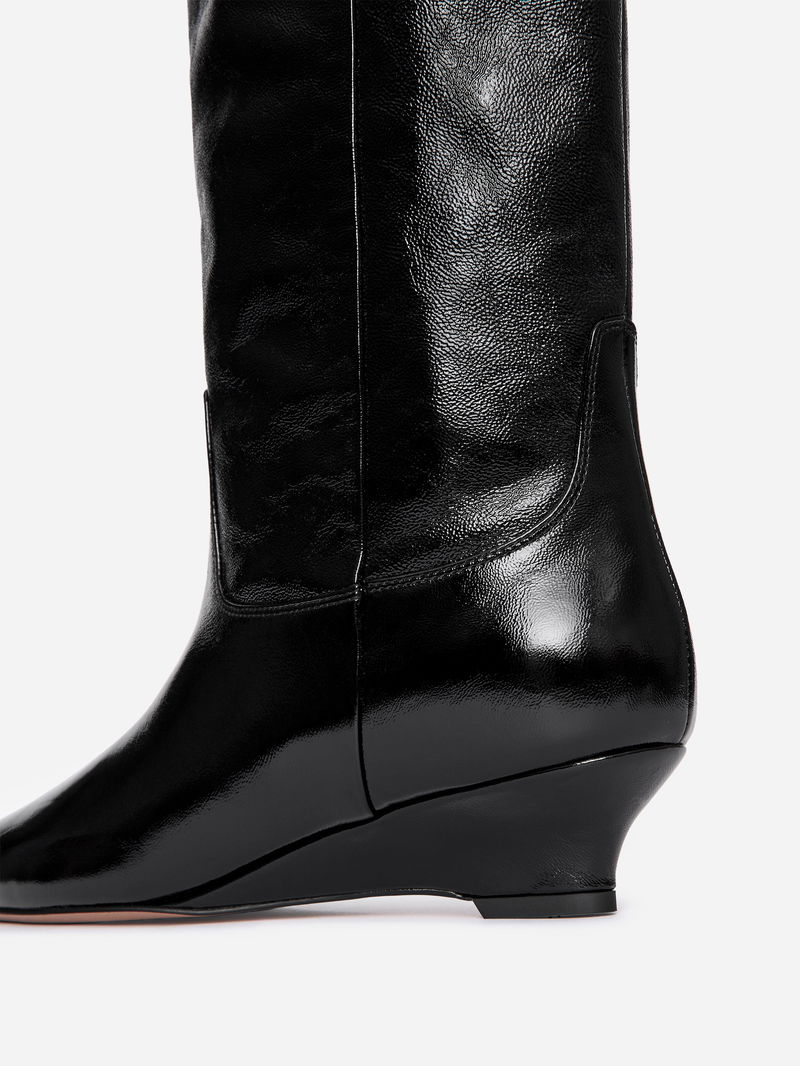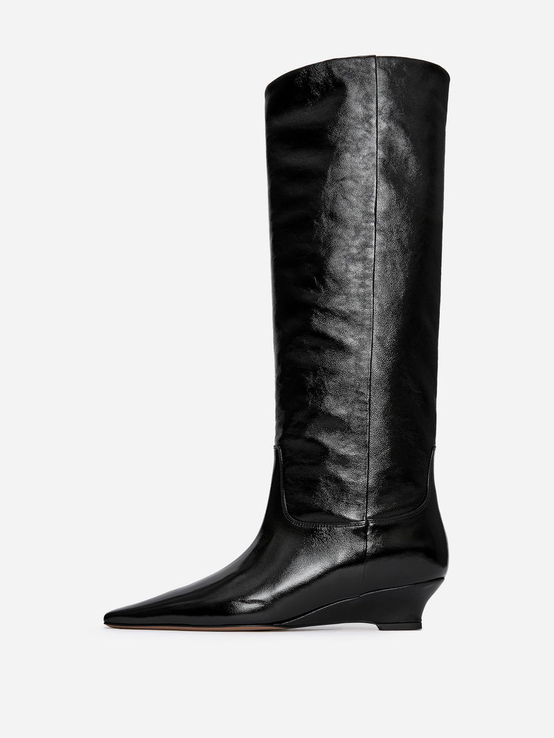 Tubular boots in glossy leather. Designed with a wedge heel and pointed toe.