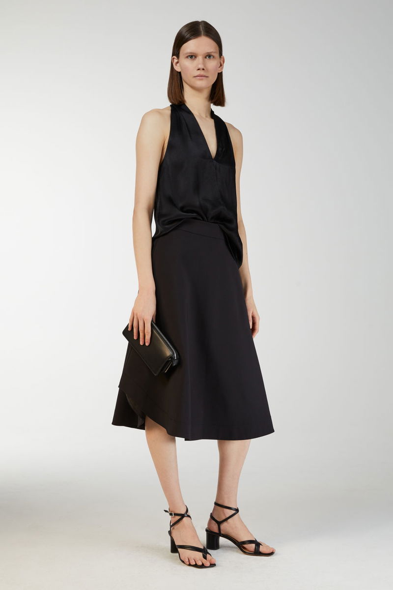 Crafted from a fluid viscose fabric with a satin finish, this tank top is a lustrous piece with a neat look. Cut with a halter-style neckline and a V-neck. The open back is detailed with a centre strap accent.